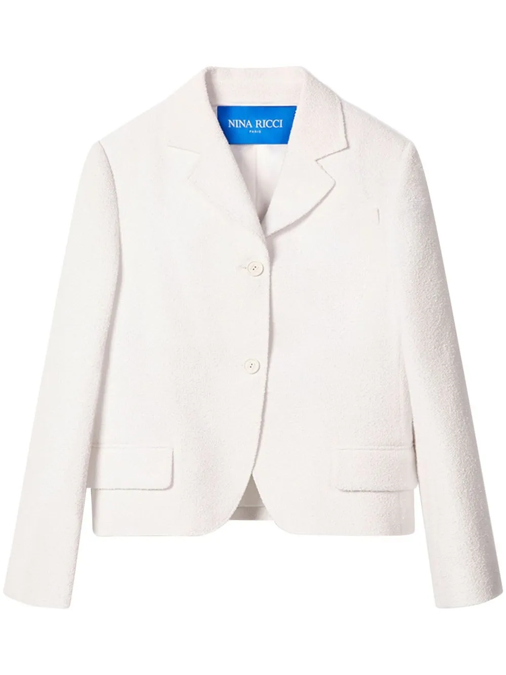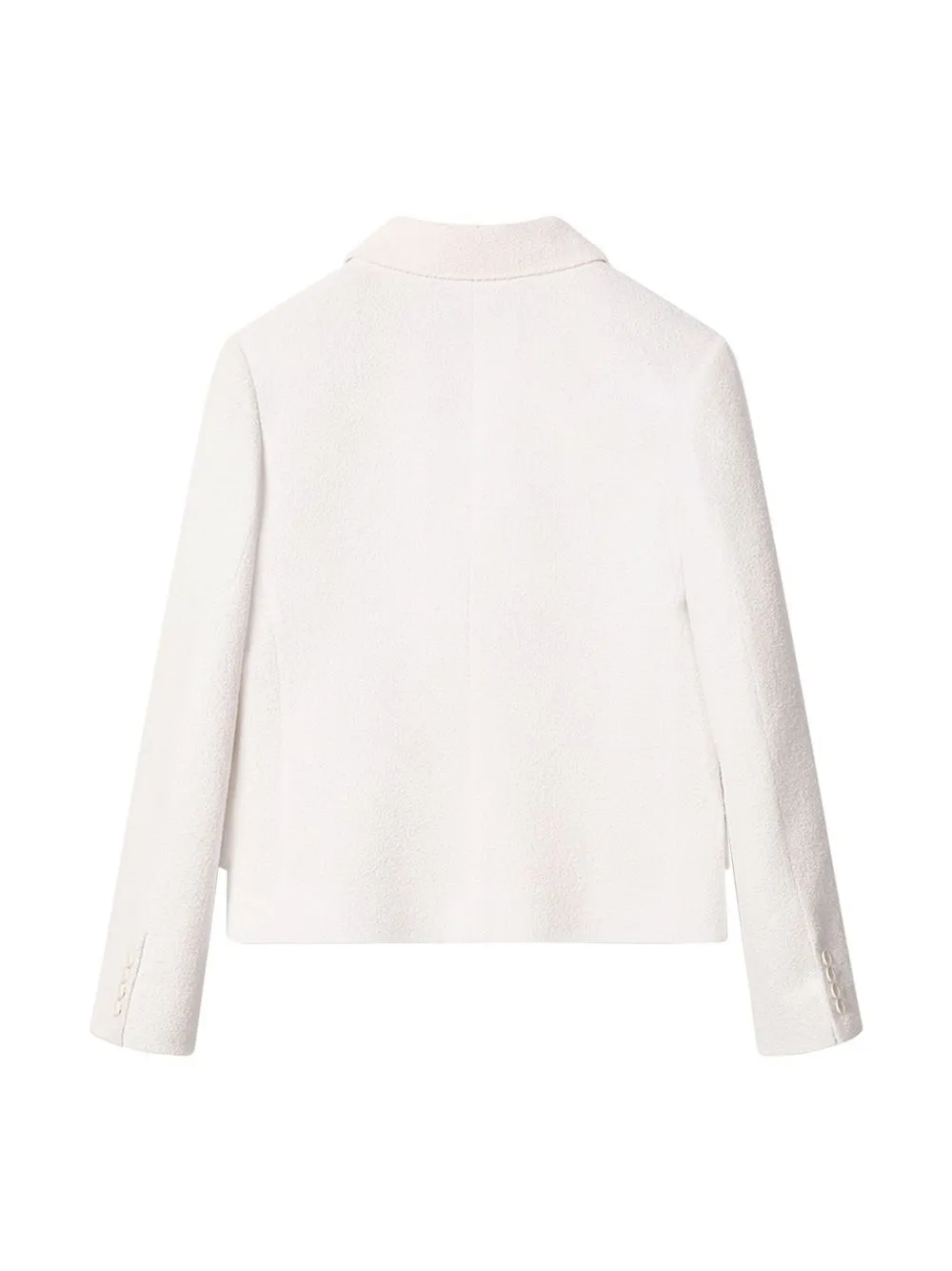 Bianco, misto cotone, costruzione bouclé, revers classici, chiusura frontale con bottoni e maniche lunghe.