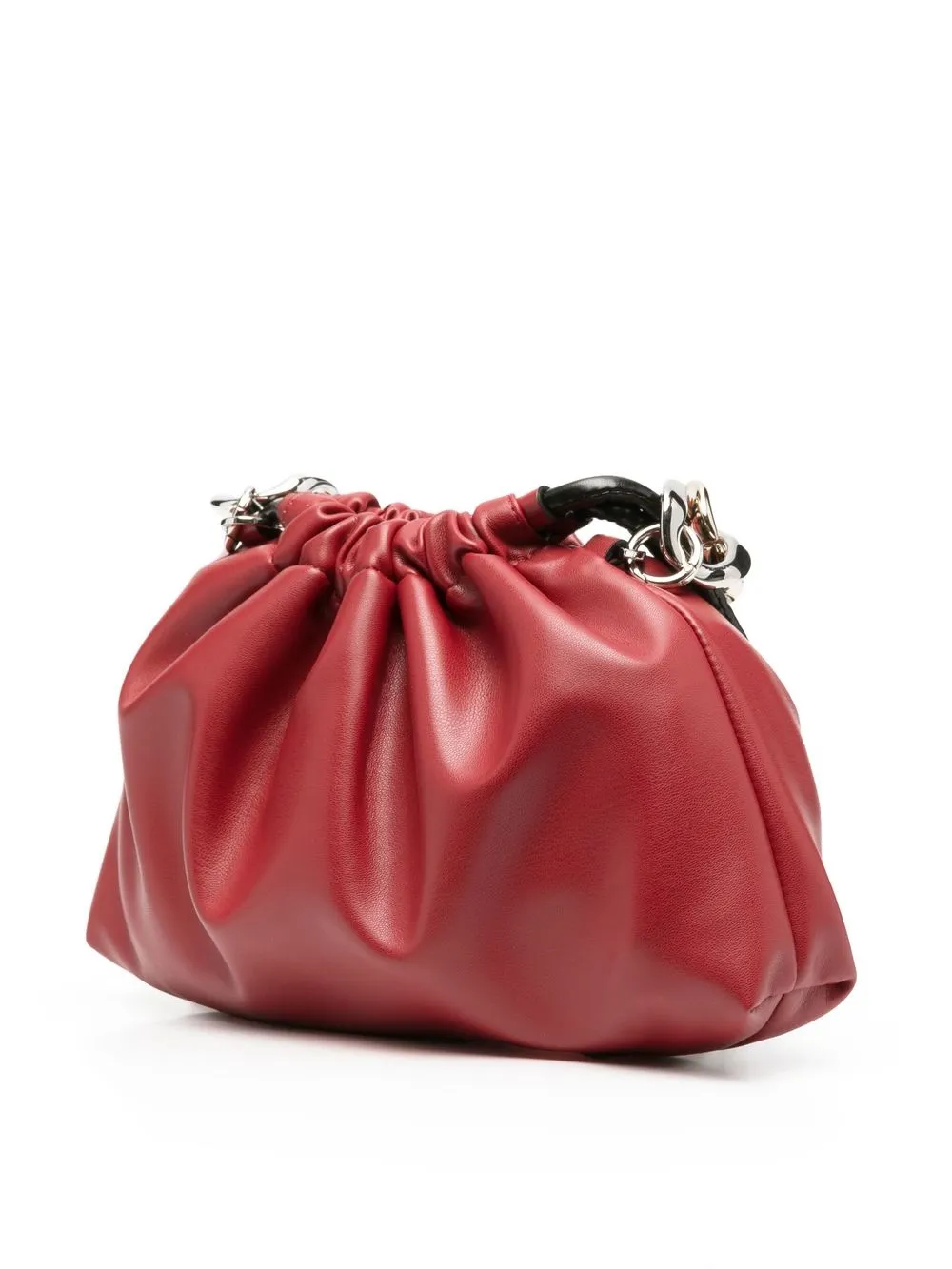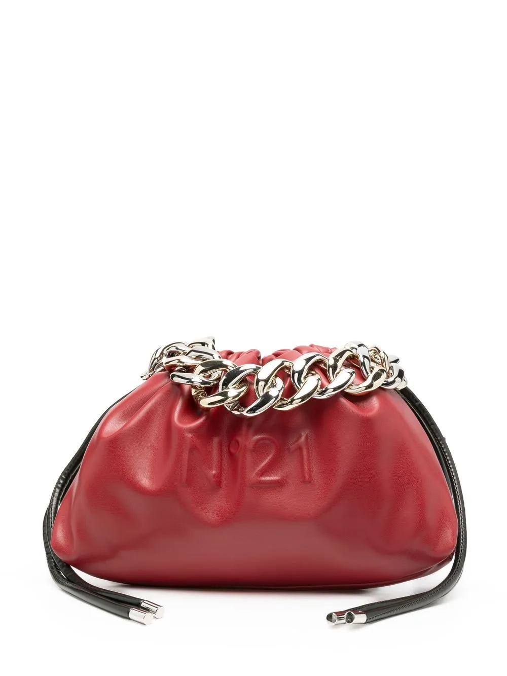 Rosso, design morbido, logo goffrato nella parte anteriore, chiusura superiore a coulisse, scomparto unico, tasca interna con zip e manico superiore con catena.