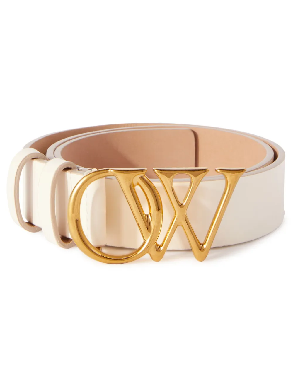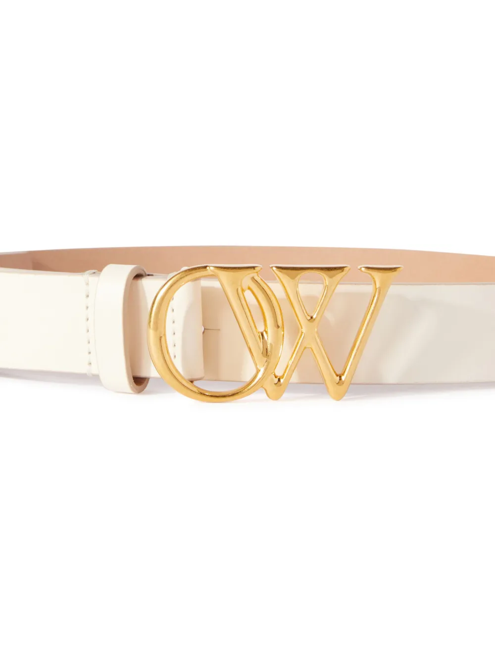 Bianco, pelle di vitello, placca con logo color oro, dettagli color oro e fori per fibbia.