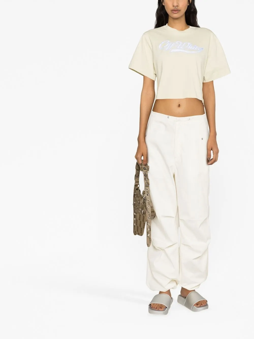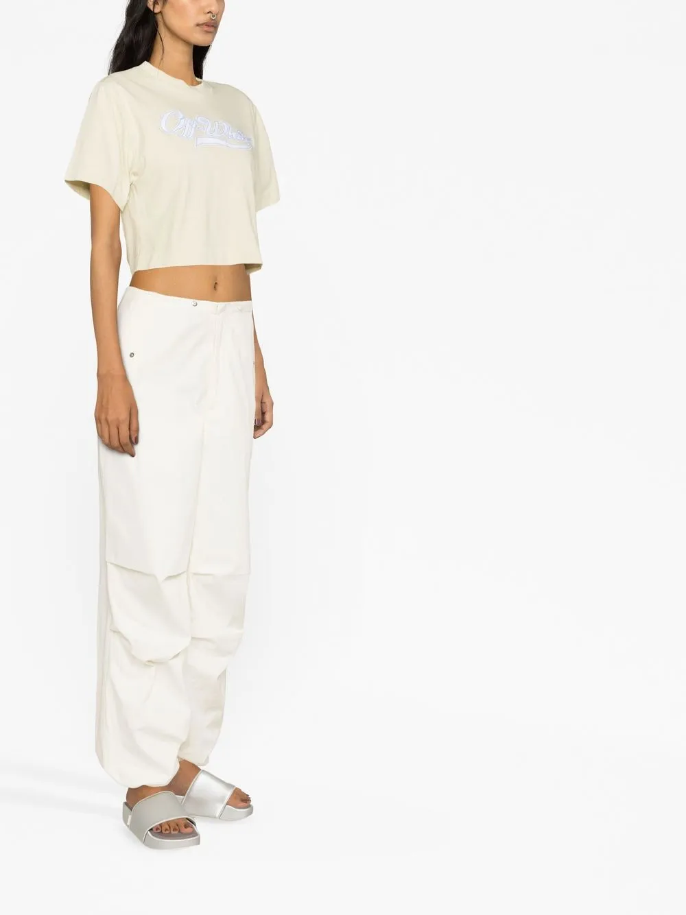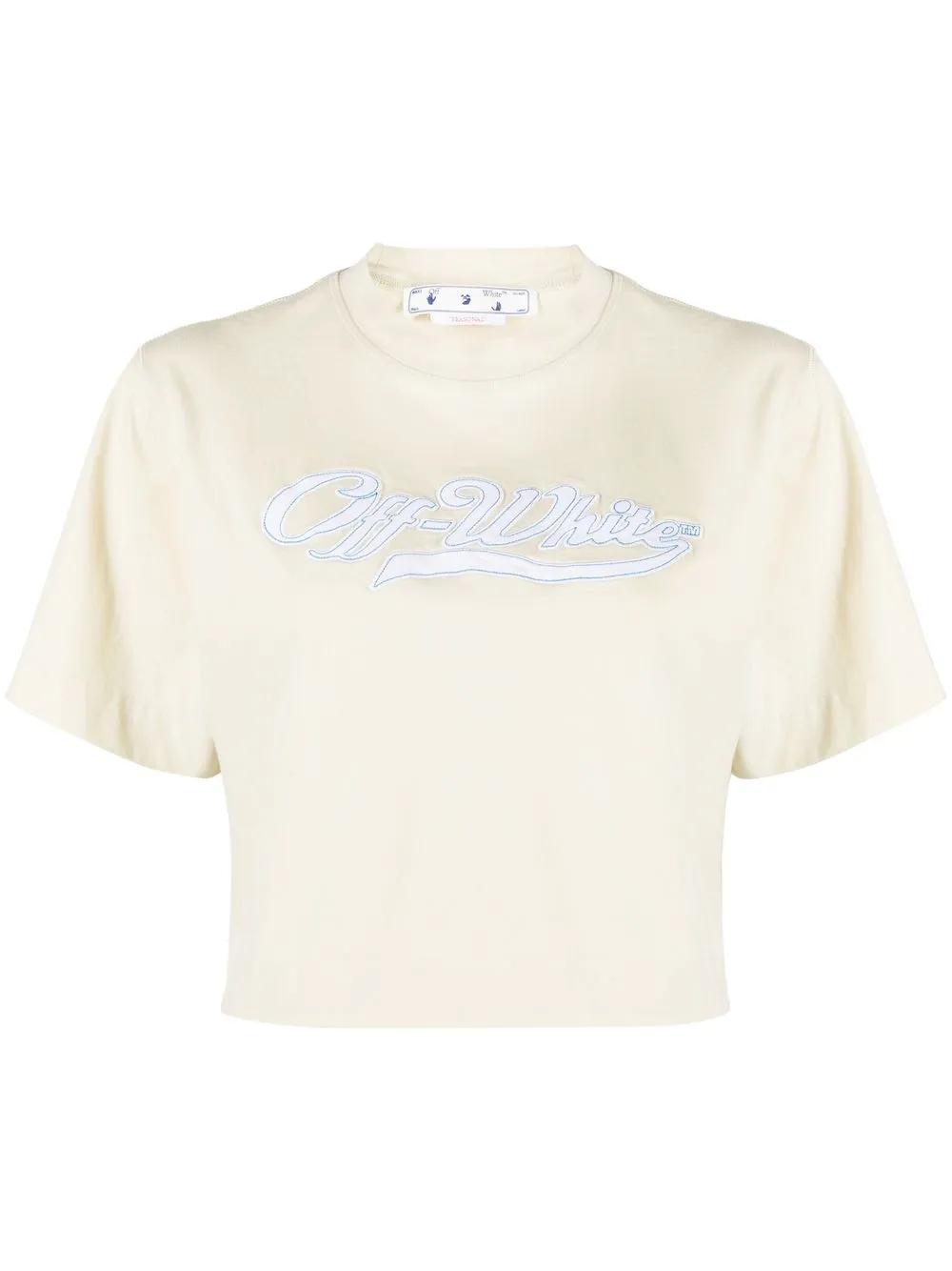 Beige chiaro, misto cotone, stampa con logo sul davanti, girocollo, maniche corte, maniche larghe, orlo dritto e design crop.