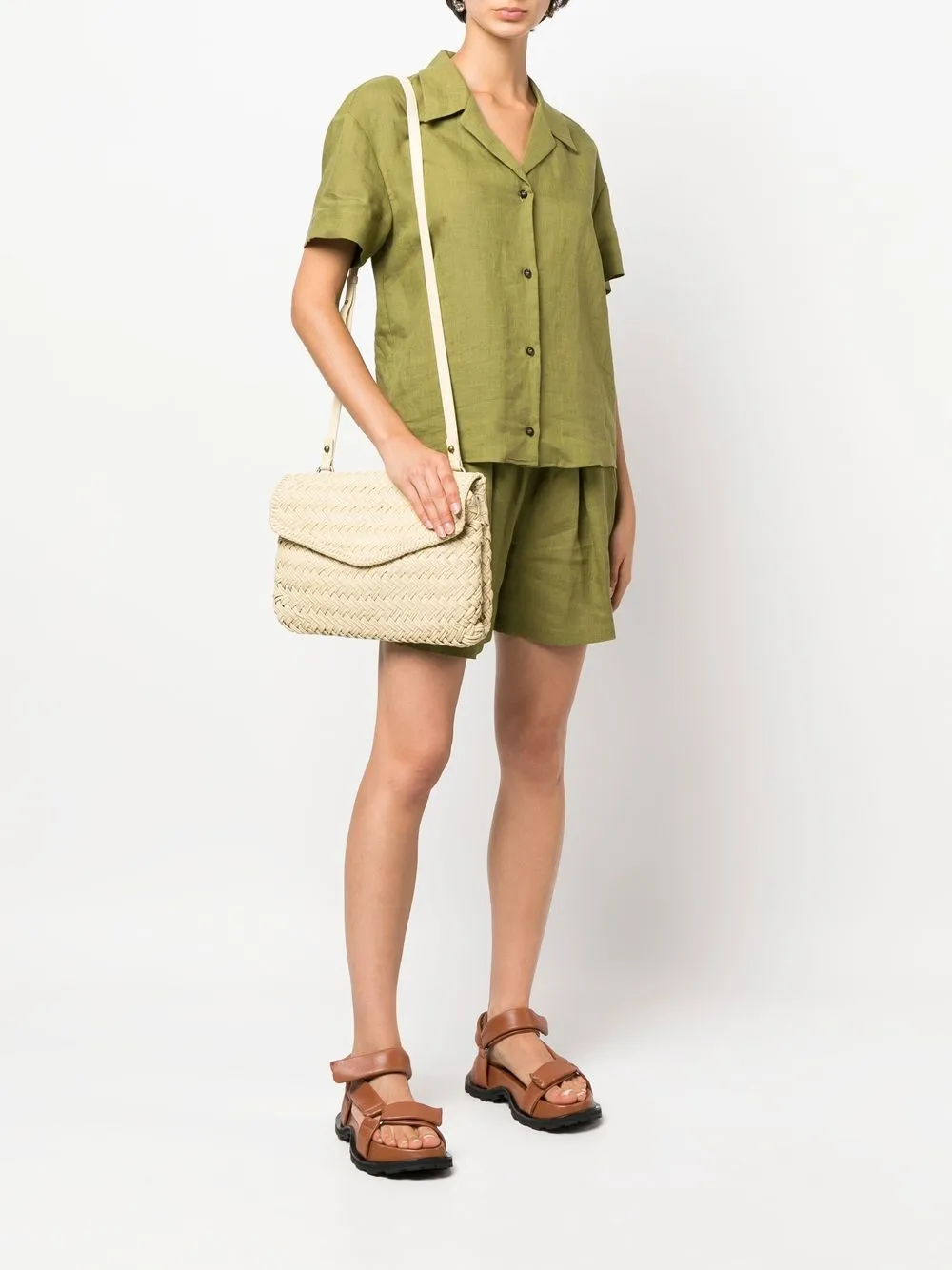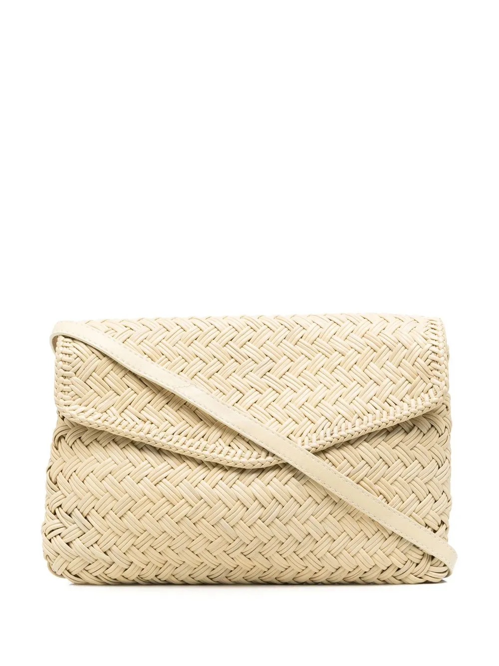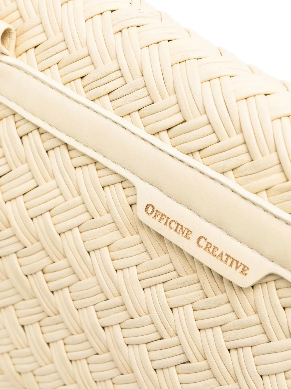 Bianco crema, pelle di vitello, design intrecciato, logo in lettere color oro, tracolla regolabile, battente nella parte superiore con chiusura magnetica, scomparto unico e tasca interna con zip.