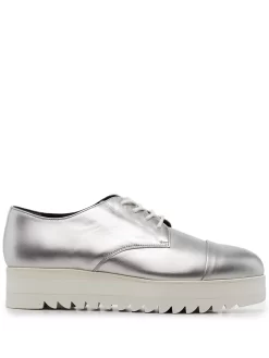 Effetto metallizzato, punta tonda, chiusura frontale con lacci, plateau e suola in gomma antiscivolo. Materiale: pelle. Colore: argento.