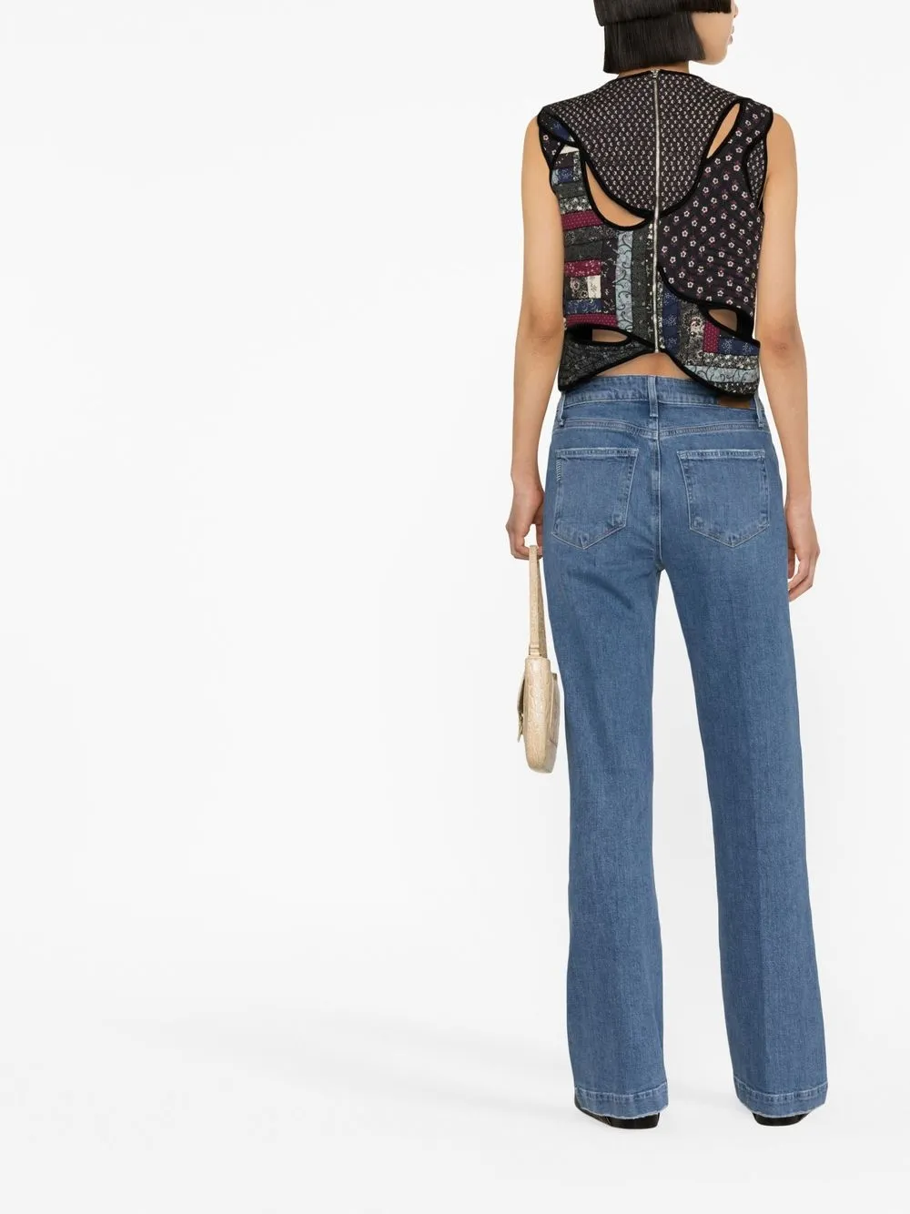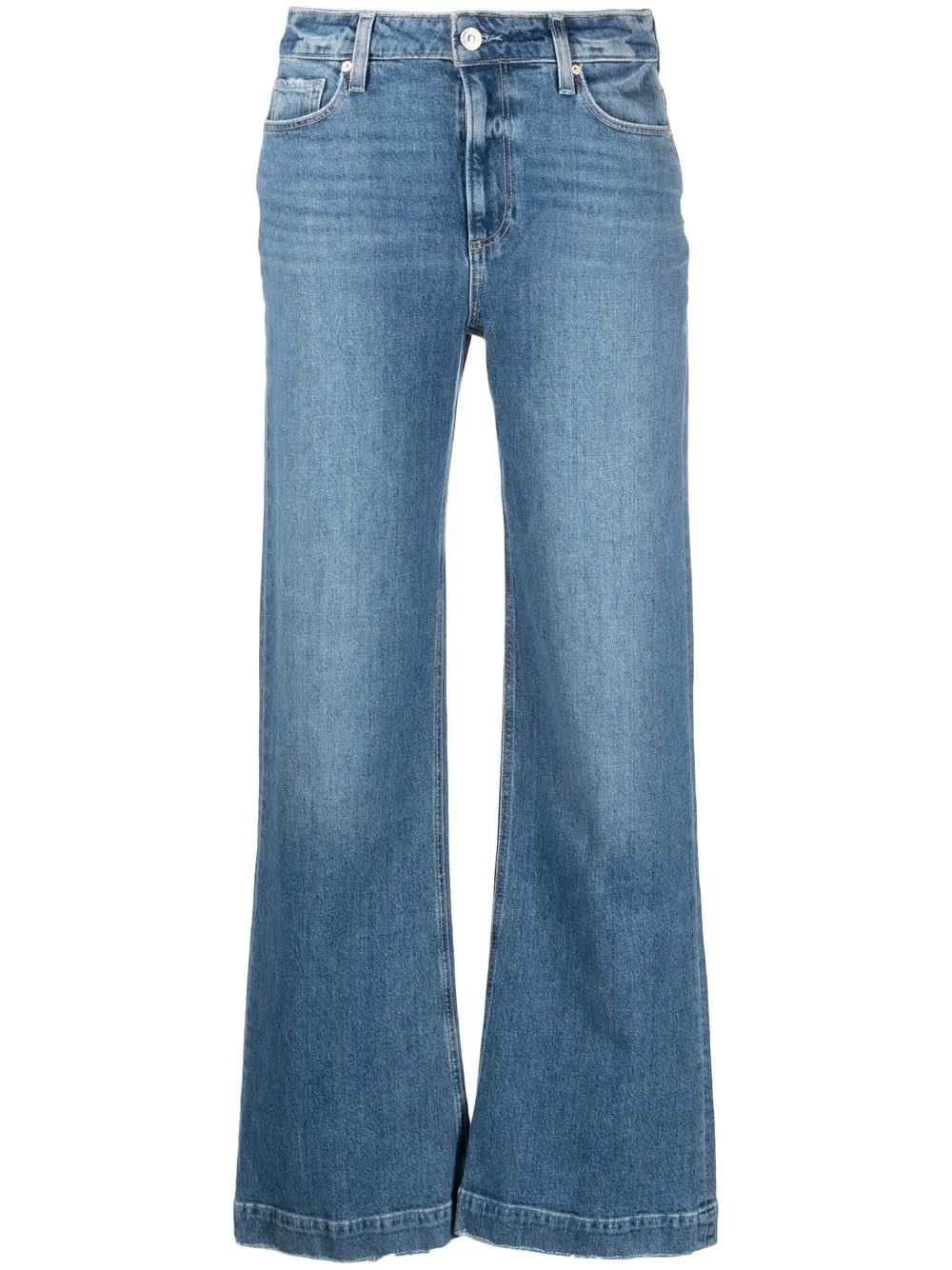 Blu, misto cotone, taglio svasato, modello a vita alta, passanti, patta con zip e design classico a cinque tasche.