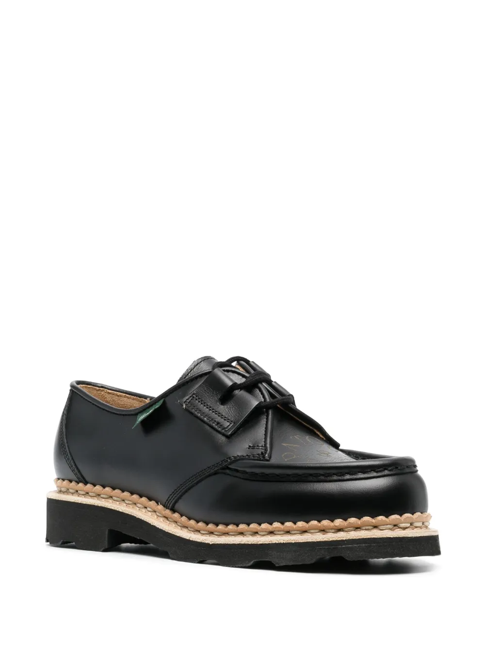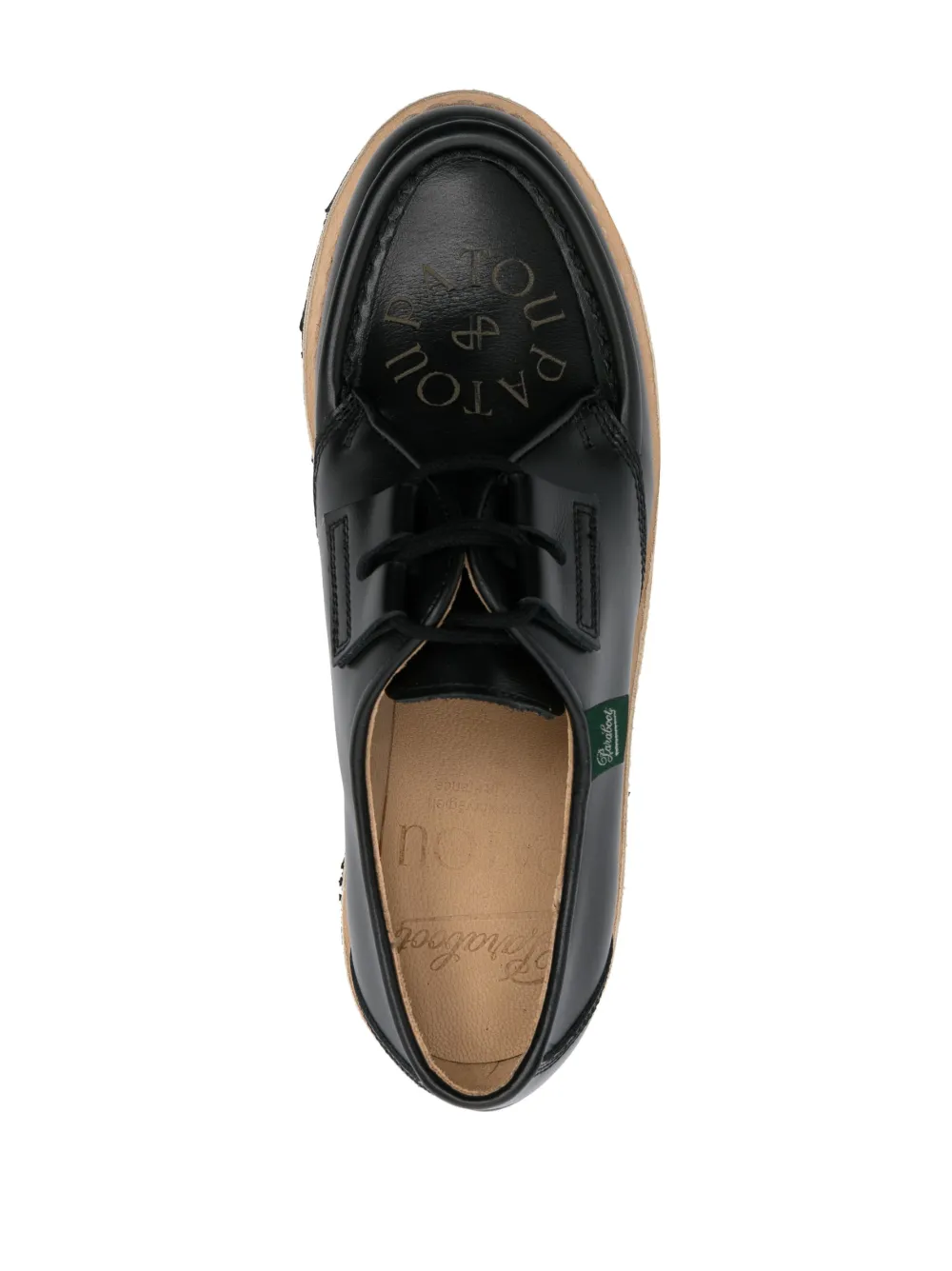 Nero, pelle di vitello, stampa con logo sul davanti, cuciture tono su tono, orlo a smerlo, punta tonda, chiusura frontale con lacci e suola in gomma antiscivolo.