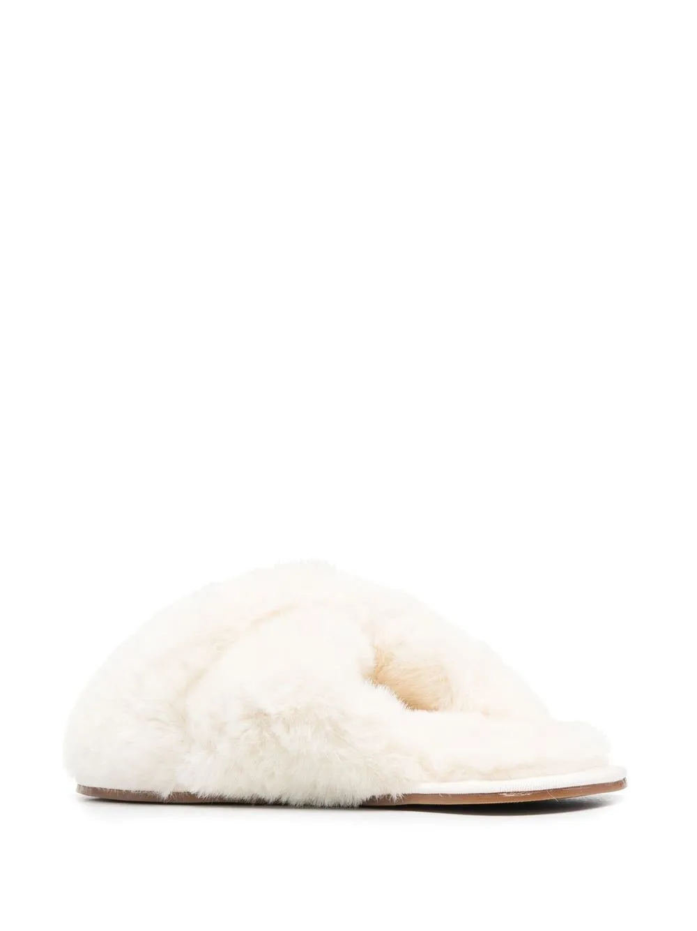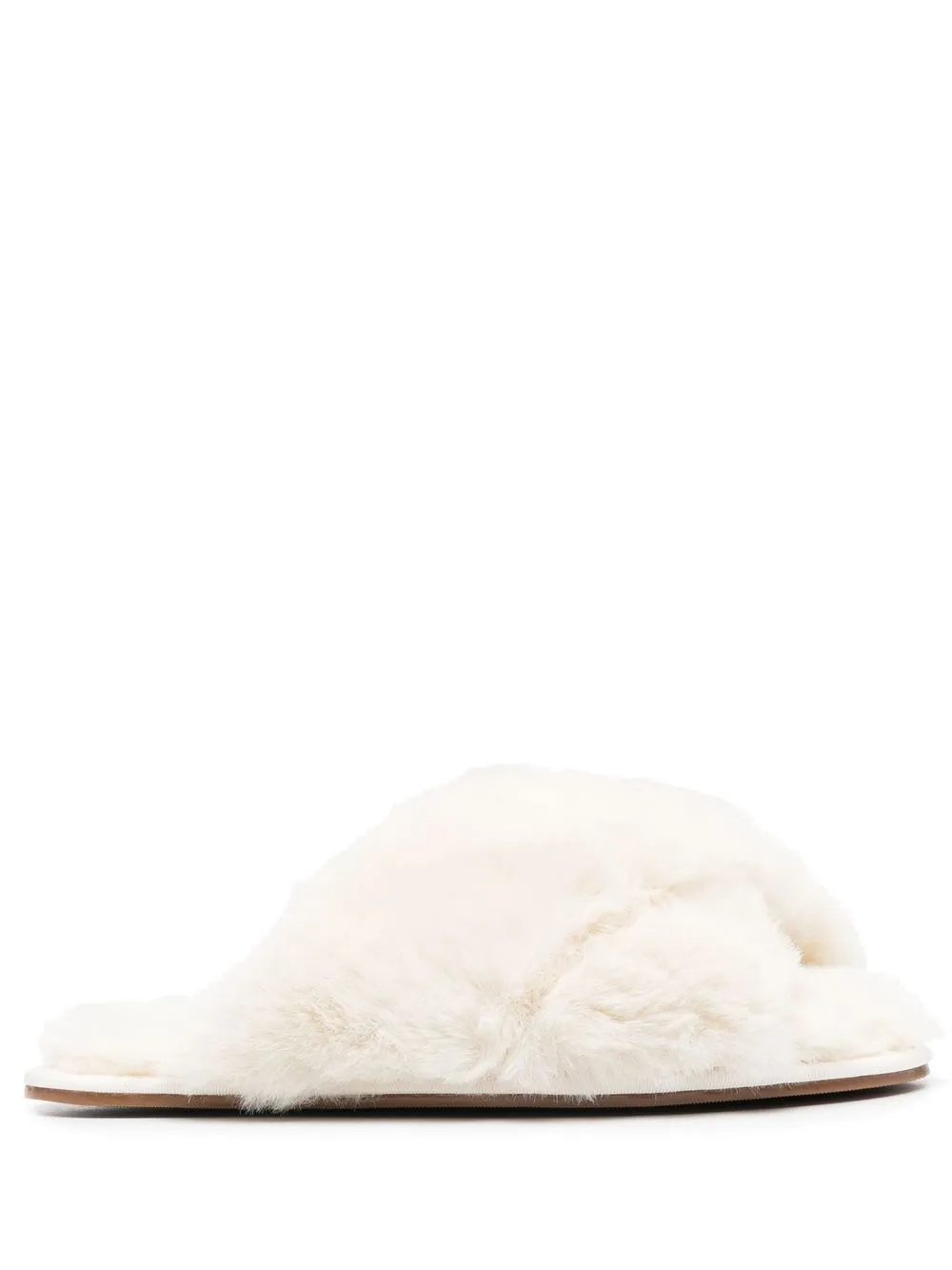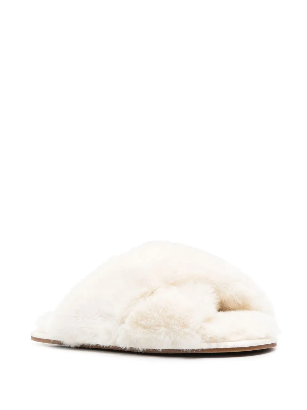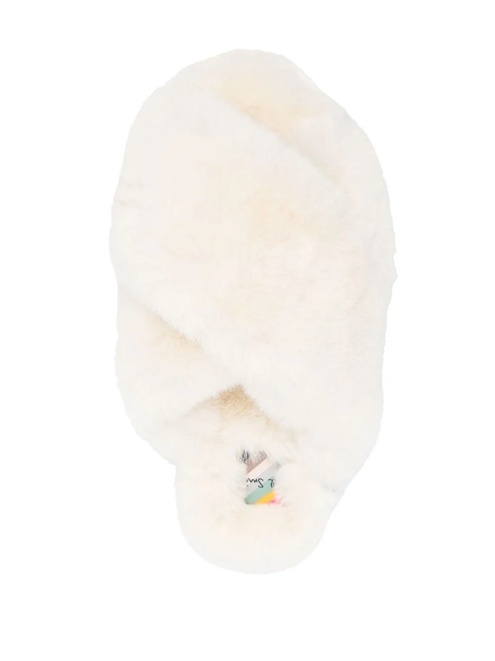 Bianco crema, rifinitura in finta pelliccia, punta aperta, dettaglio con fasce incrociate, soletta con logo, suola piatta in gomma e design slip-on.