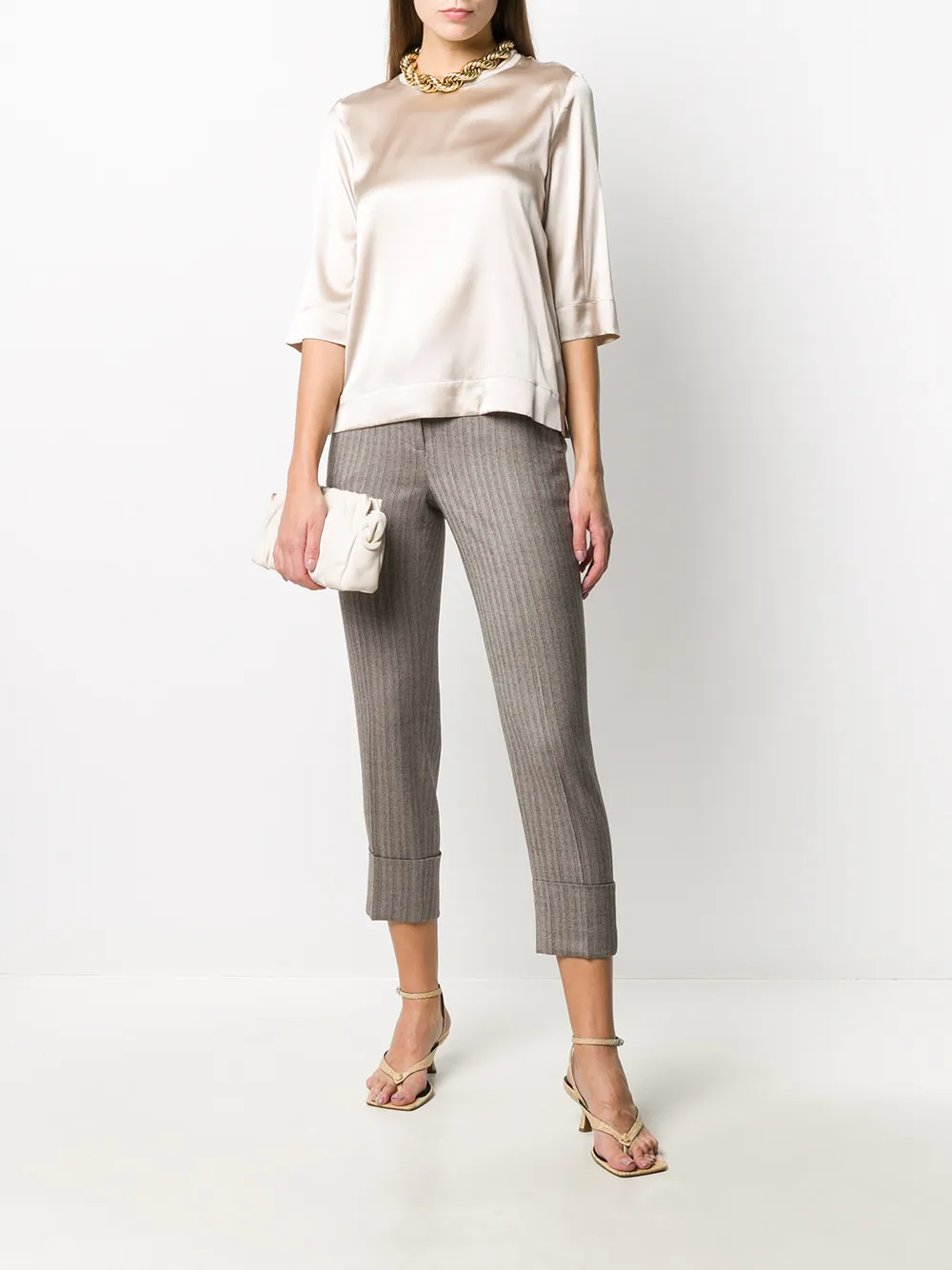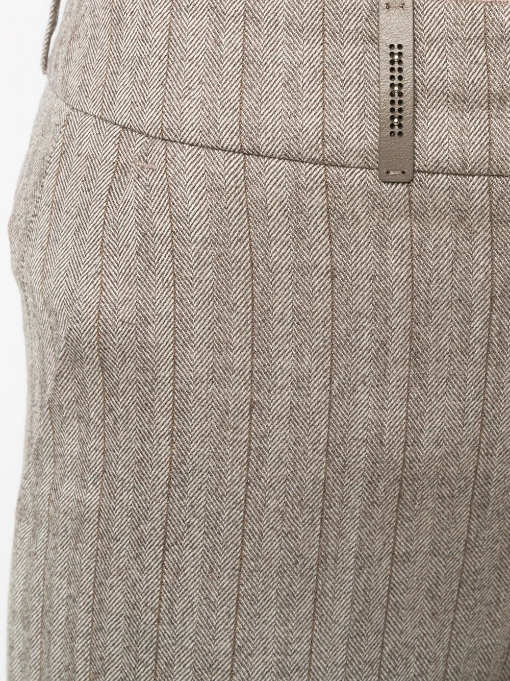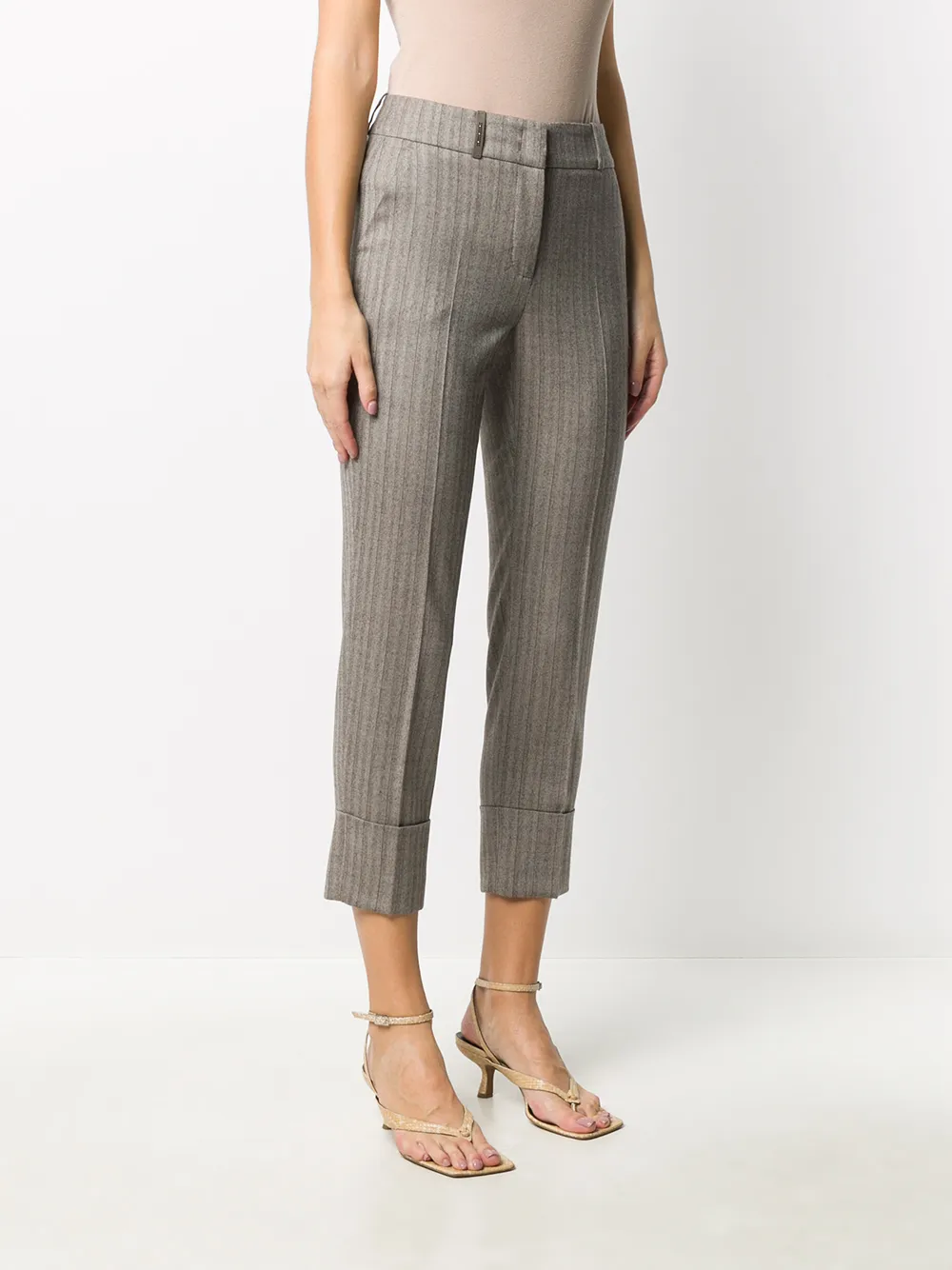 Dettaglio a righe, passanti, due tasche laterali a soffietto, due tasche posteriori a filetto, taglio crop e chiusura frontale nascosta. Colore: di colore grigio.