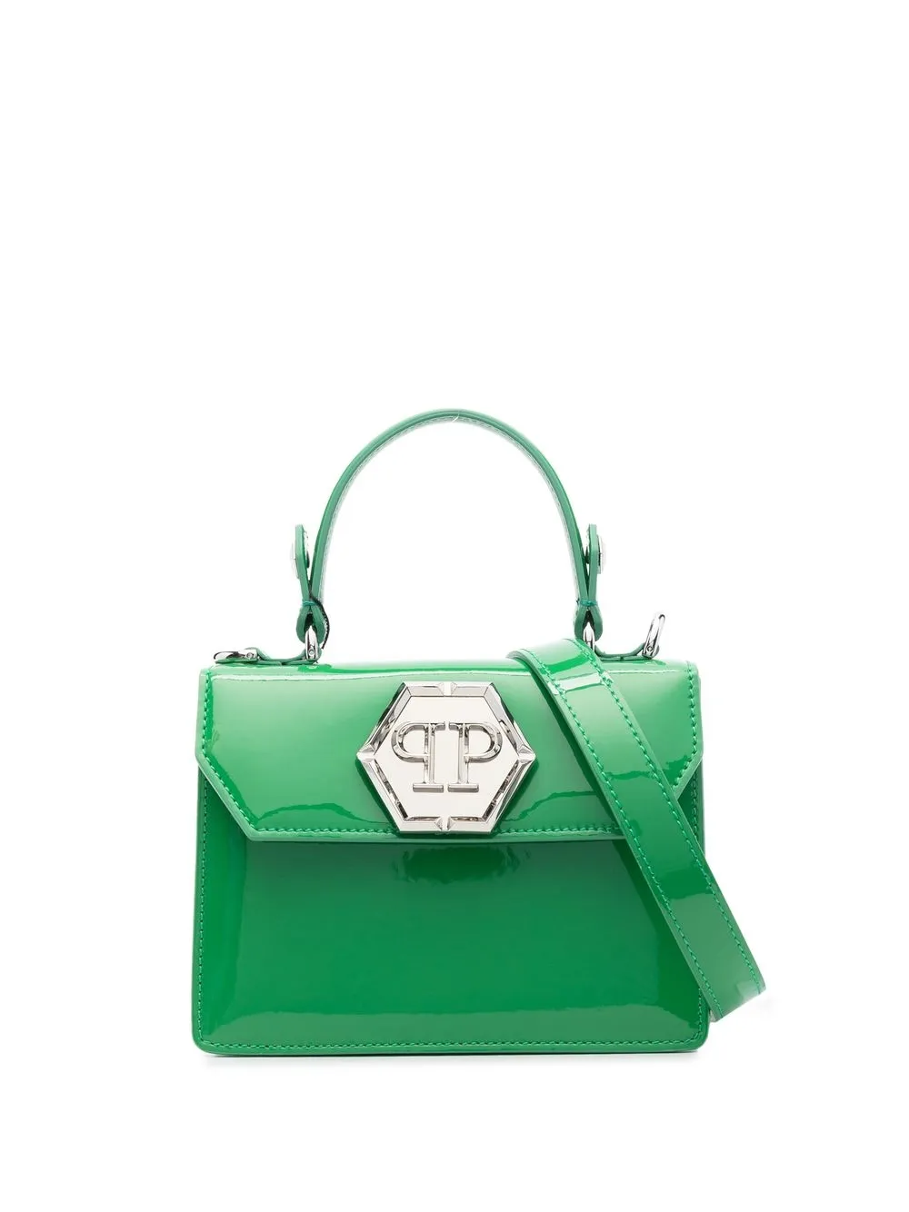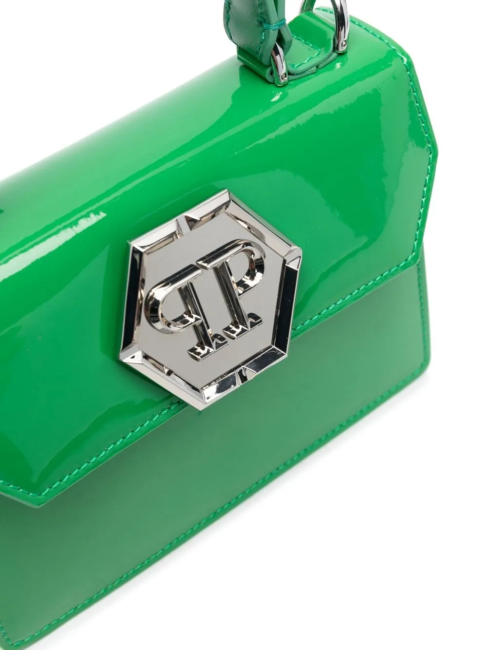 Verde edera, pelle di vitello, finitura lucida, dettagli color argento, tasca a soffietto sul retro, pattina nella parte superiore, placca con logo, chiusura a clip, scomparto unico, fessura portacarta interna e placca con logo interna.