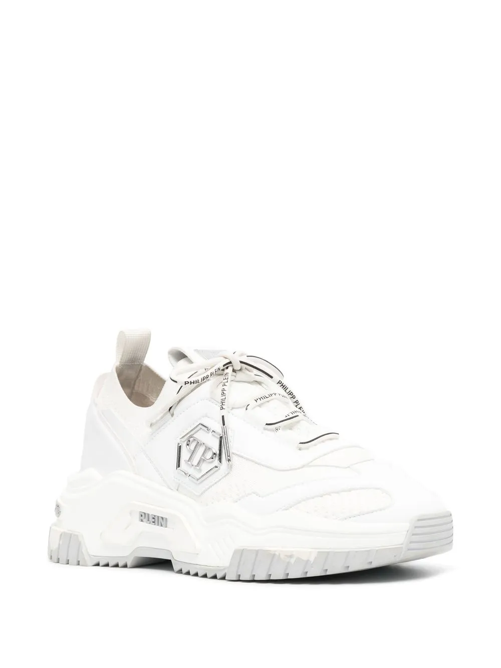 Bianco, pelle di vitello, pannelli in rete, placca con logo, punta tonda, chiusura frontale con lacci, soletta con logo, linguetta sul tallone e suola chunky in gomma.