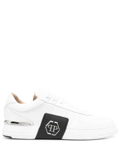 Bianco, pelle di vitello, linguetta con logo stampato, dettaglio traforato, chiusura frontale con lacci, punta tonda e suola piatta in gomma.