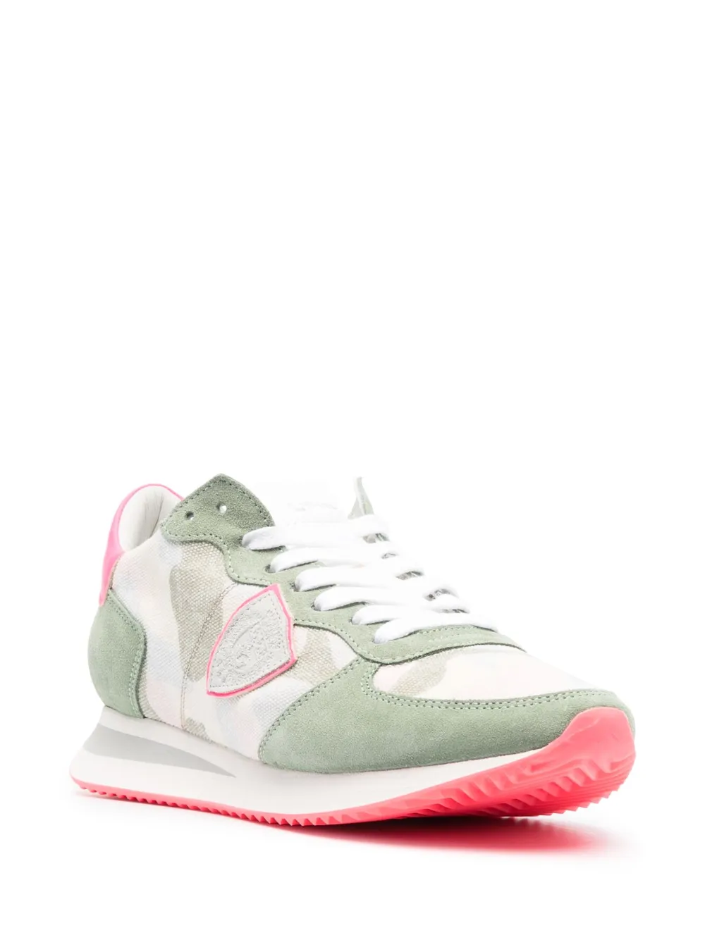 Verde, multicolore, pelle di vitello, pelle scamosciata di vitello, stampa mimetica, design a inserti, punta tonda, chiusura frontale con lacci, linguetta con logo goffrato, soletta con logo e suola piatta in gomma.