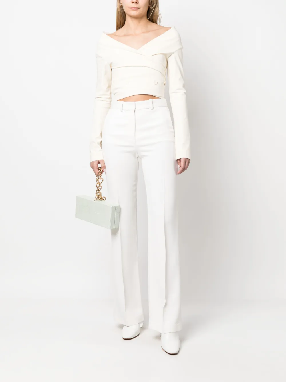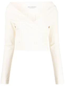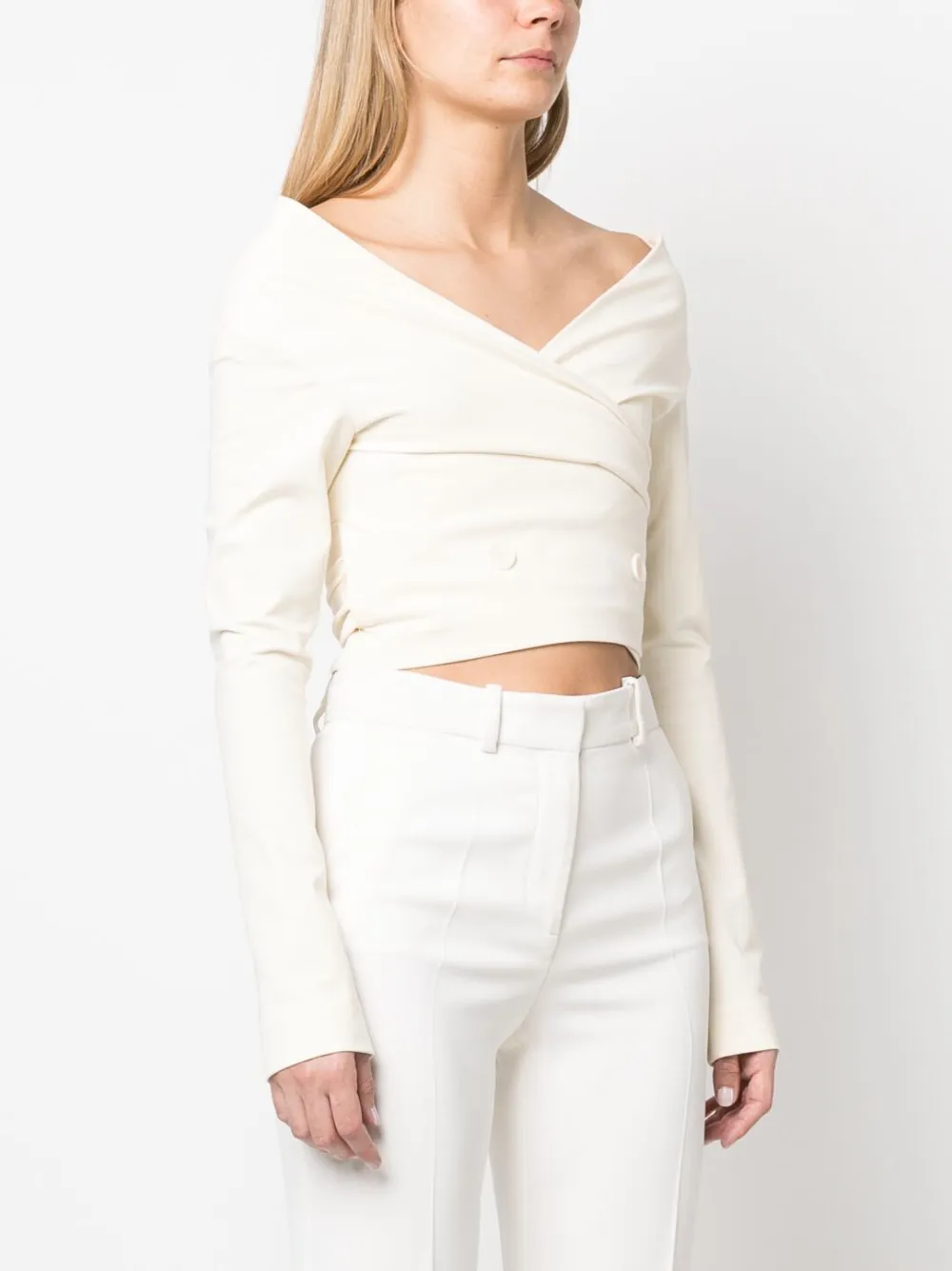 Bianco, misto cotone, scollo a V, chiusura decentrata frontale con bottoni, maniche lunghe e design crop.