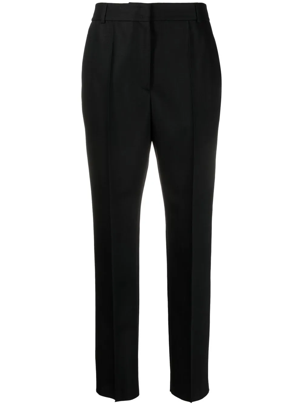 Nero, passanti, chiusura con bottone e zip nascosta, piega stirata, due tasche posteriori nascoste e gamba affusolata.