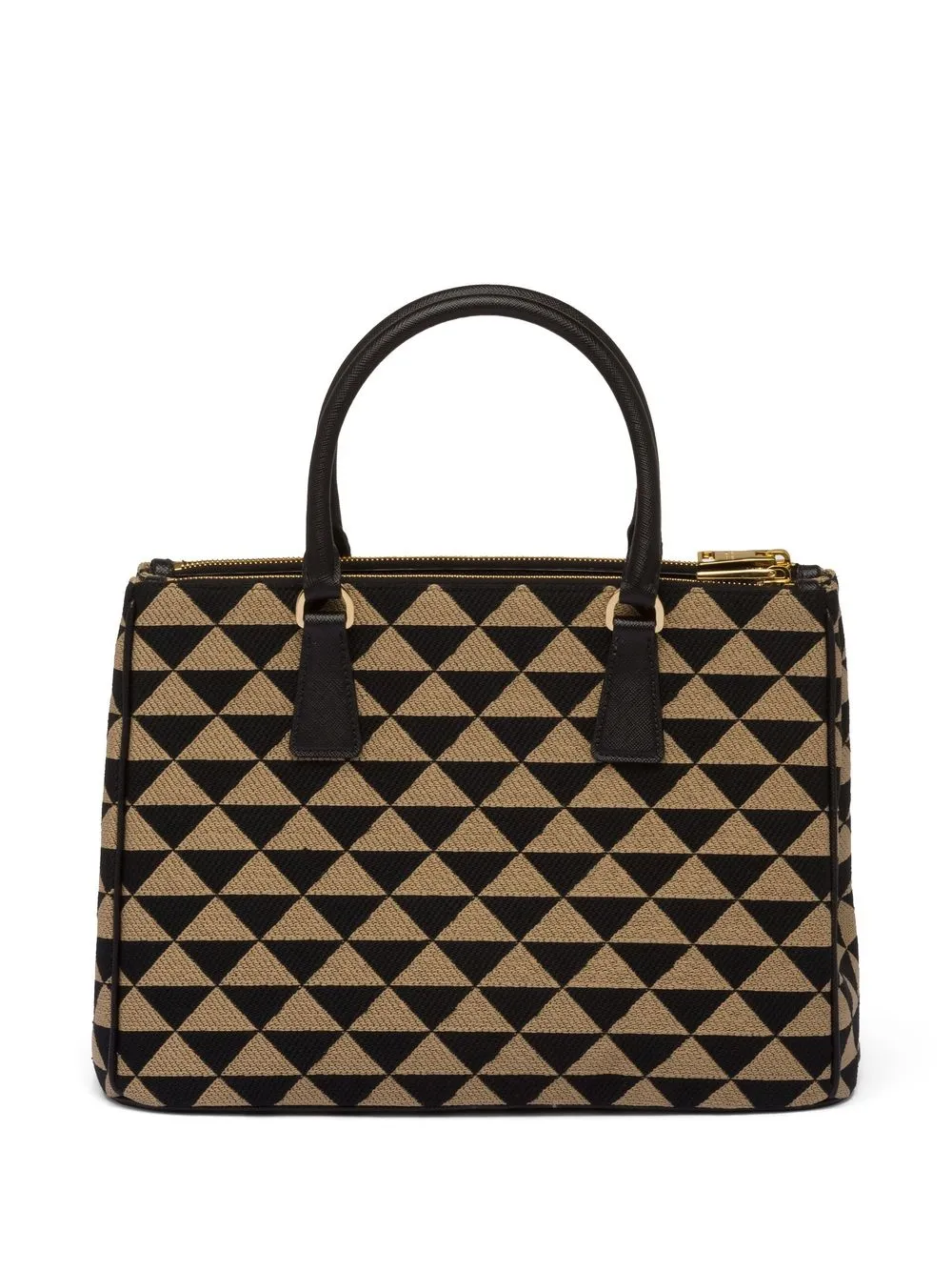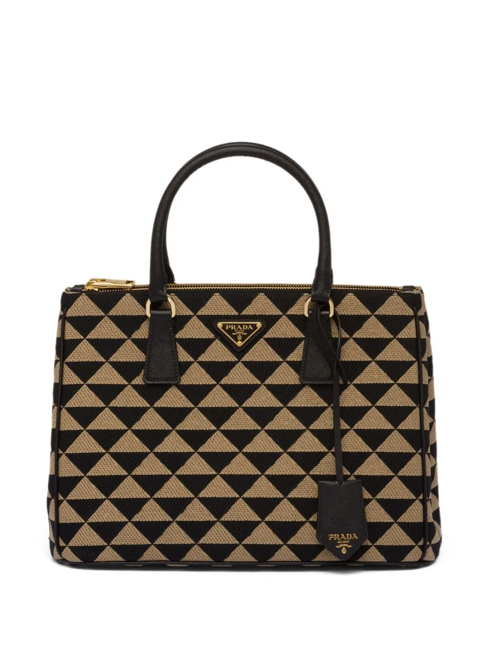 Nero, beige, pelle, design ricamato, placca con logo, chiusura superiore con zip, scomparto interno diviso, tasca interna con zip, due manici e tracolla regolabile e rimovibile.