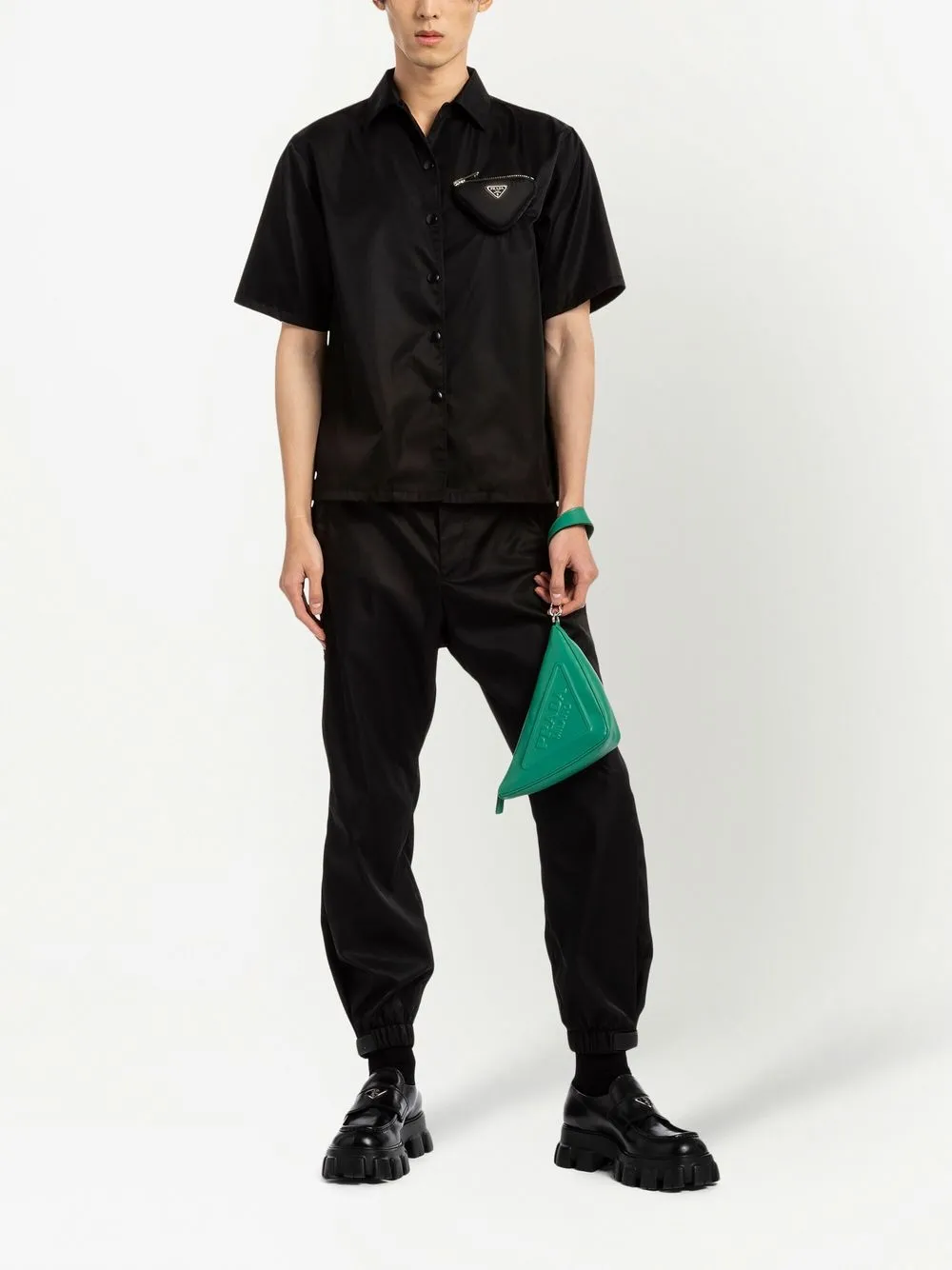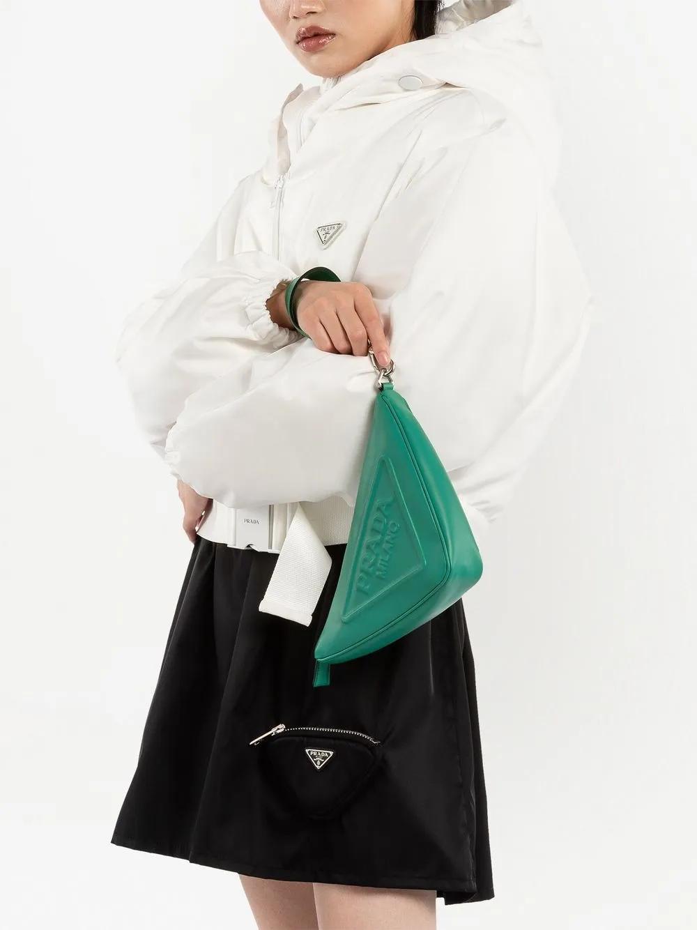 Verde, cuoio, design a triangolo, placca con logo, logo goffrato nella parte anteriore, chiusura superiore con zip e cinturino da polso.