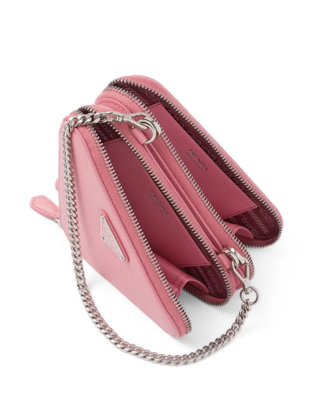 Rosa pastello, pelle Saffiano, triangolo in smalto con logo, design a triangolo, dettagli color argento, tracolla regolabile e rimovibile e manico superiore rimovibile con catena.