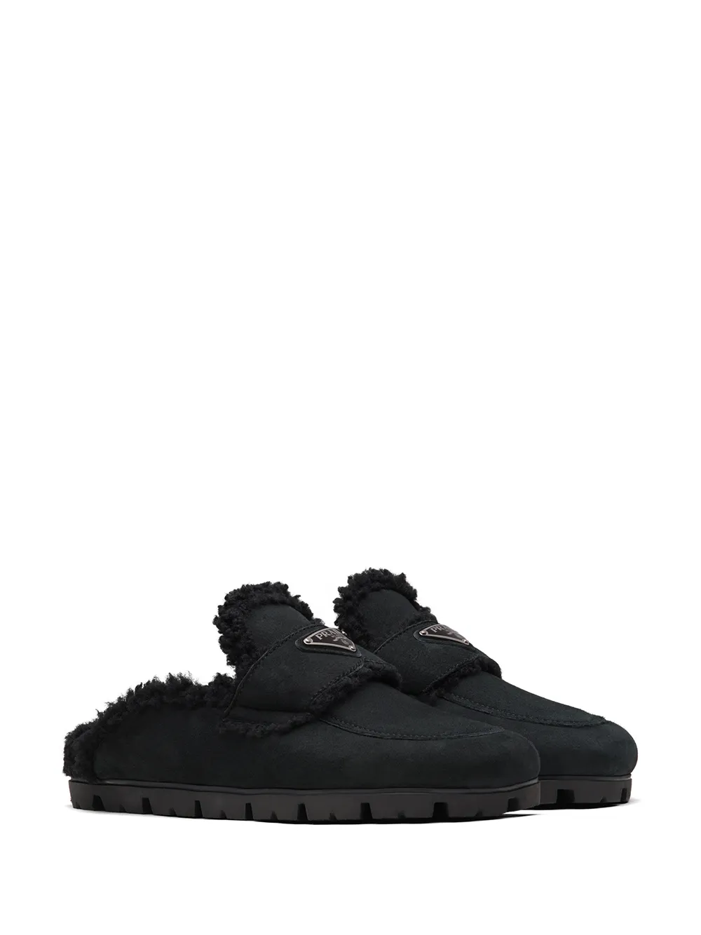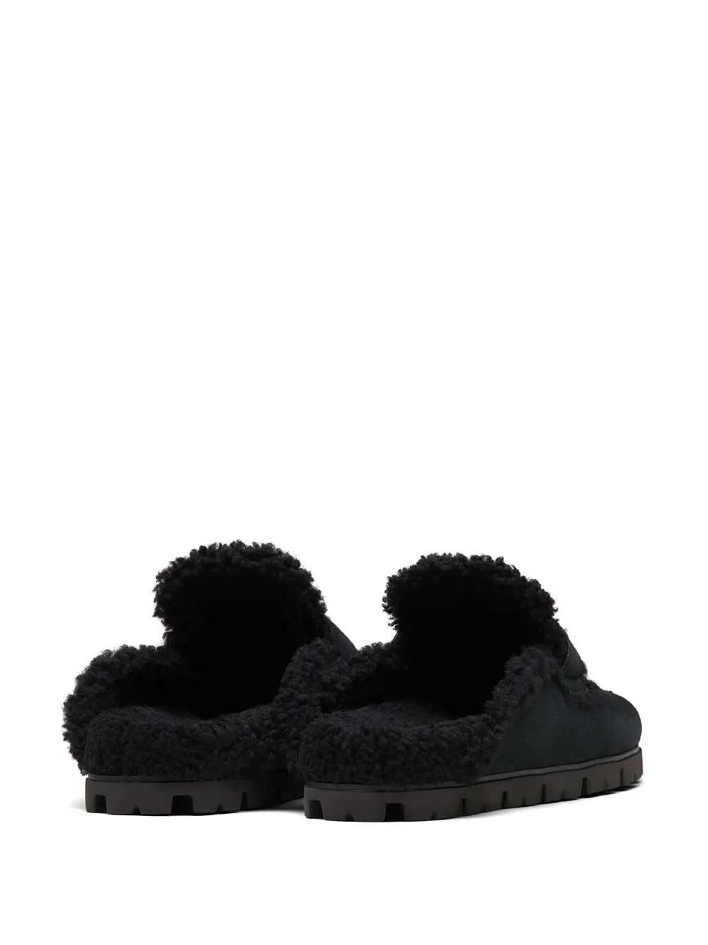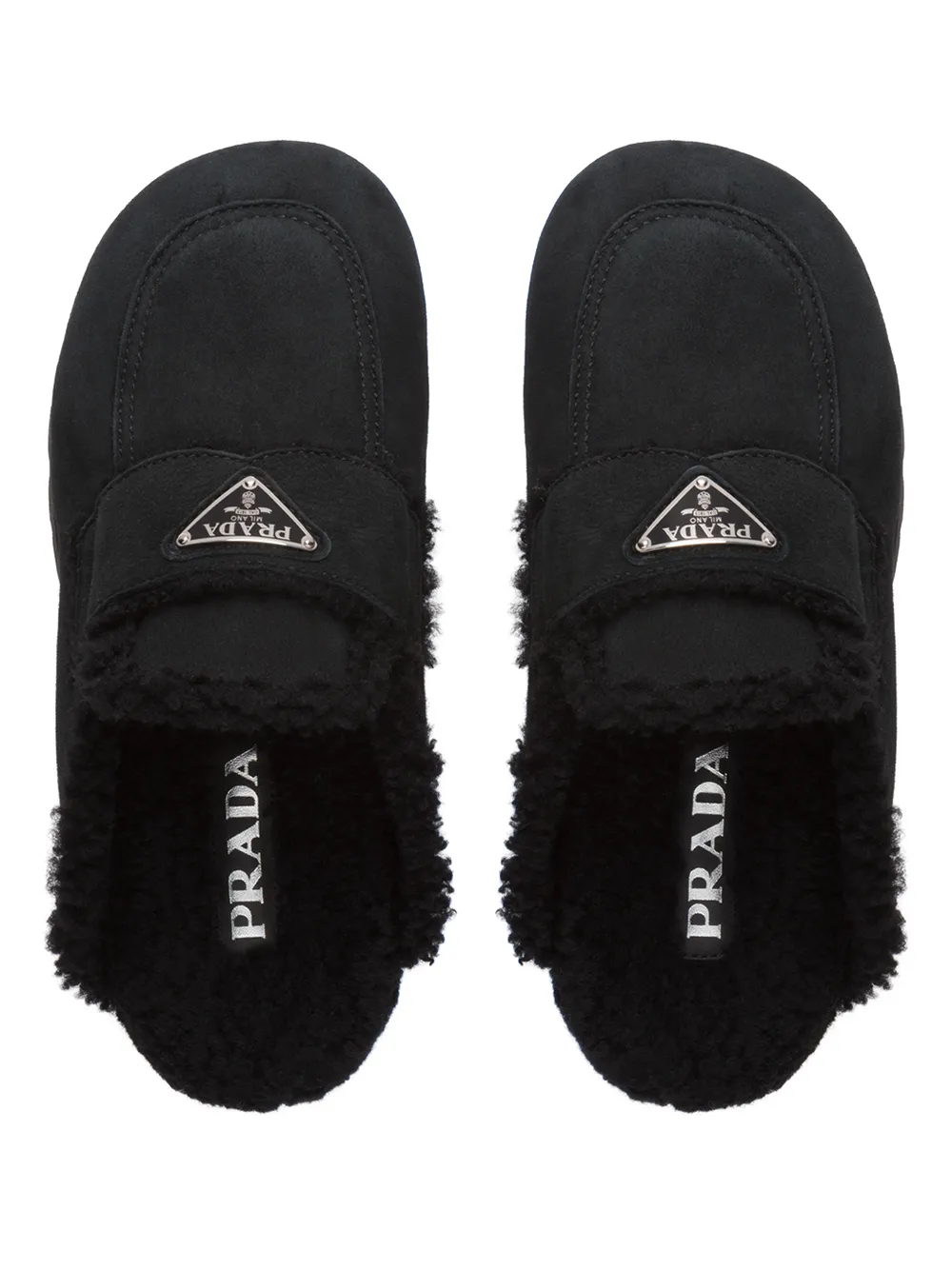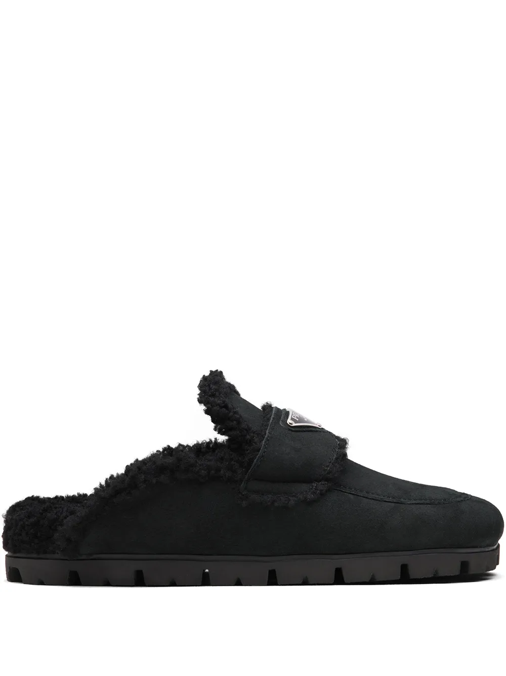 Triangolo in smalto con logo, fodera in Shearling, punta tonda, design senza aperture e suola in gomma antiscivolo. Materiale: pelle. Colore: nero.