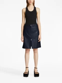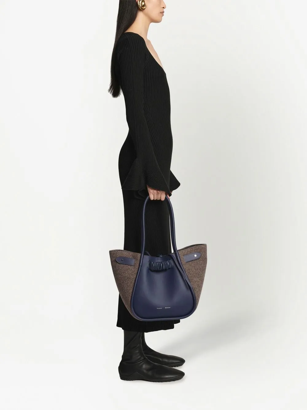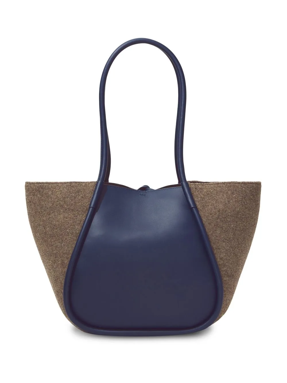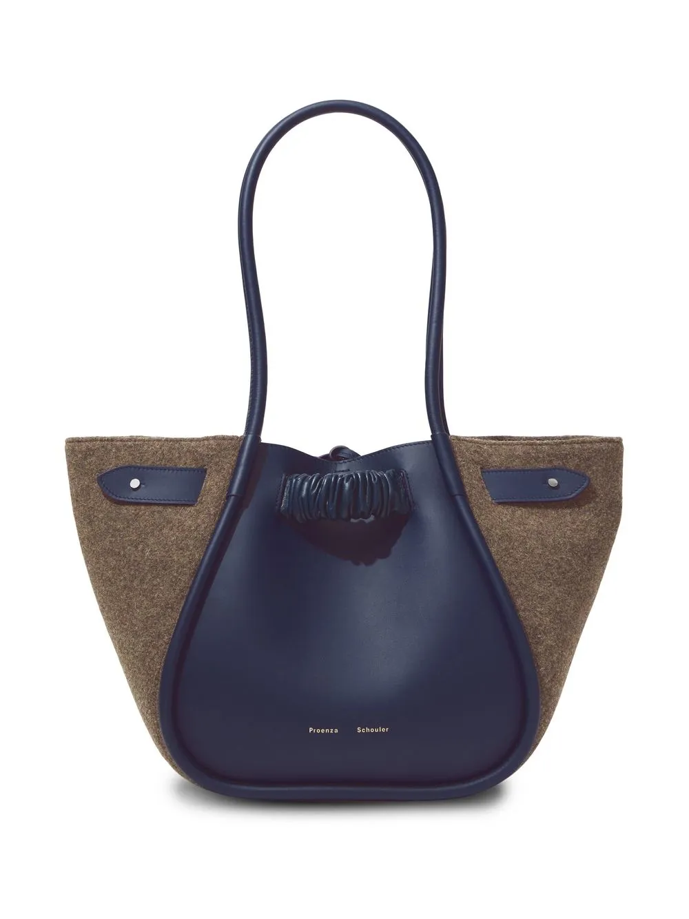 Blu navy, marrone, pelle di vitello, design feltrato, logo in lettere color oro, dettaglio con ruches, due manici lunghi, chiusura a coulisse e pouch rimovibile.