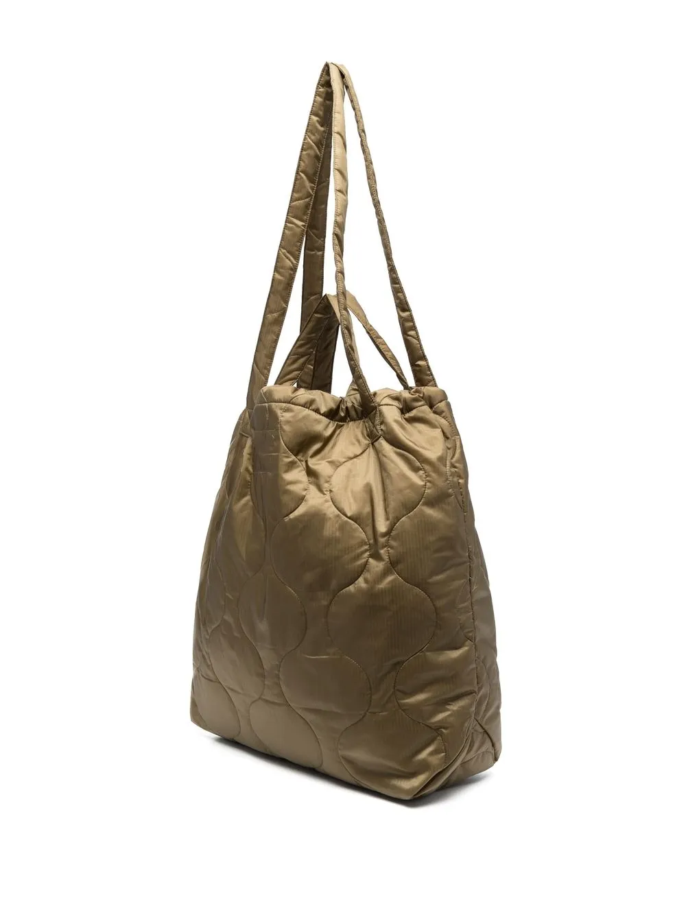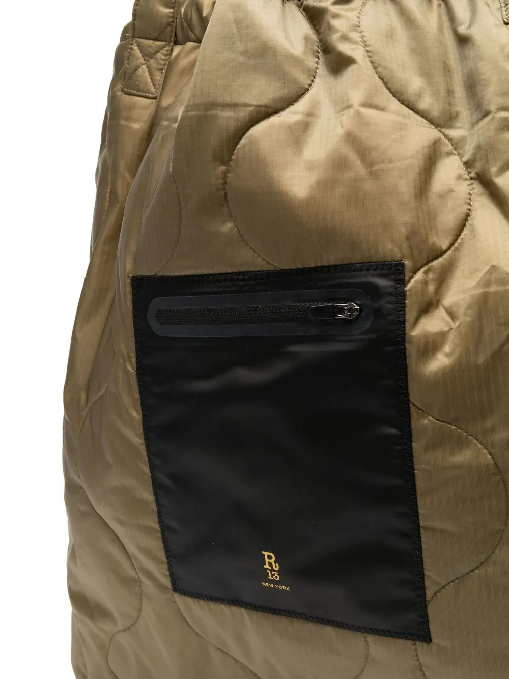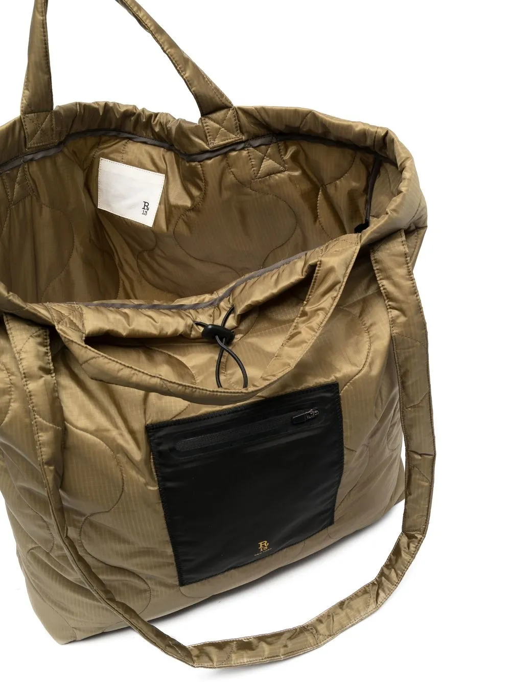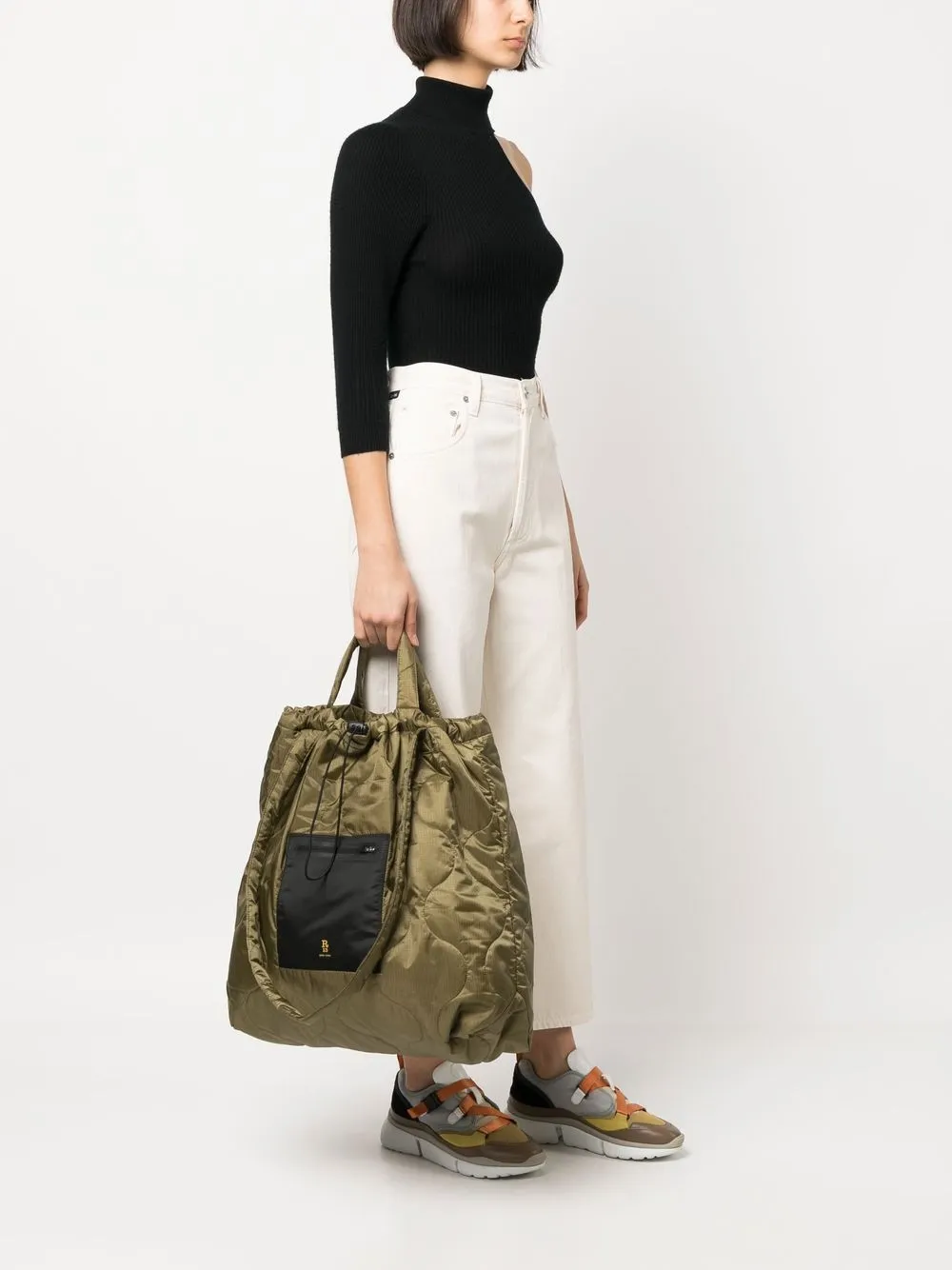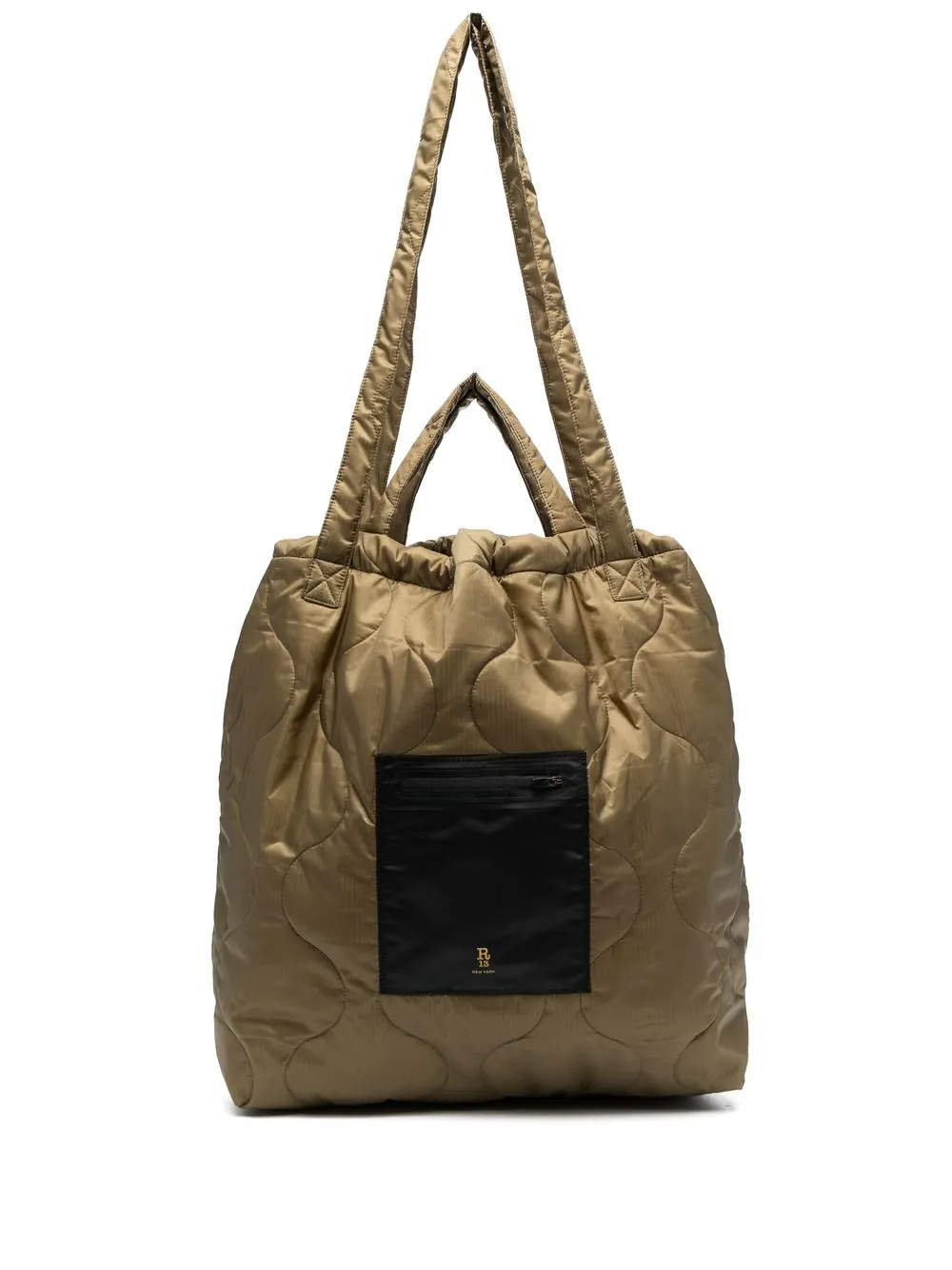 Verde oliva, design trapuntato, stampa con logo sul davanti, tasca frontale con zip, due manici, design con fascia singola, scomparto unico e applicazione interna con logo.