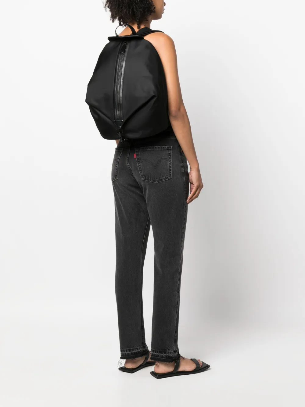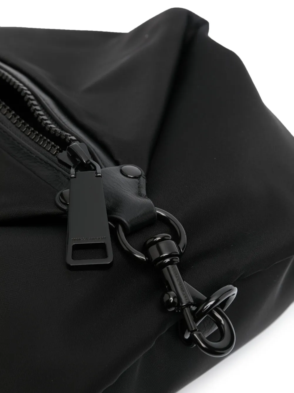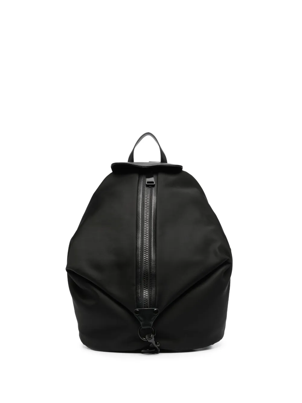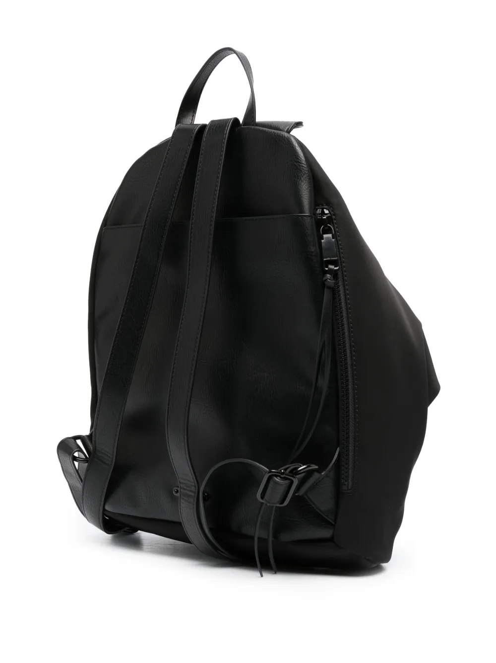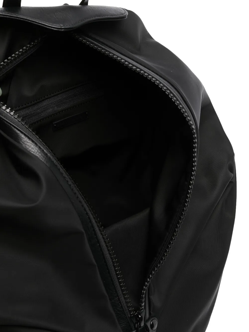 Nero, cuciture tono su tono, chiusura frontale con zip, chiusura posteriore con zip, due tracolle regolabili, manico superiore e tasca interna con zip.