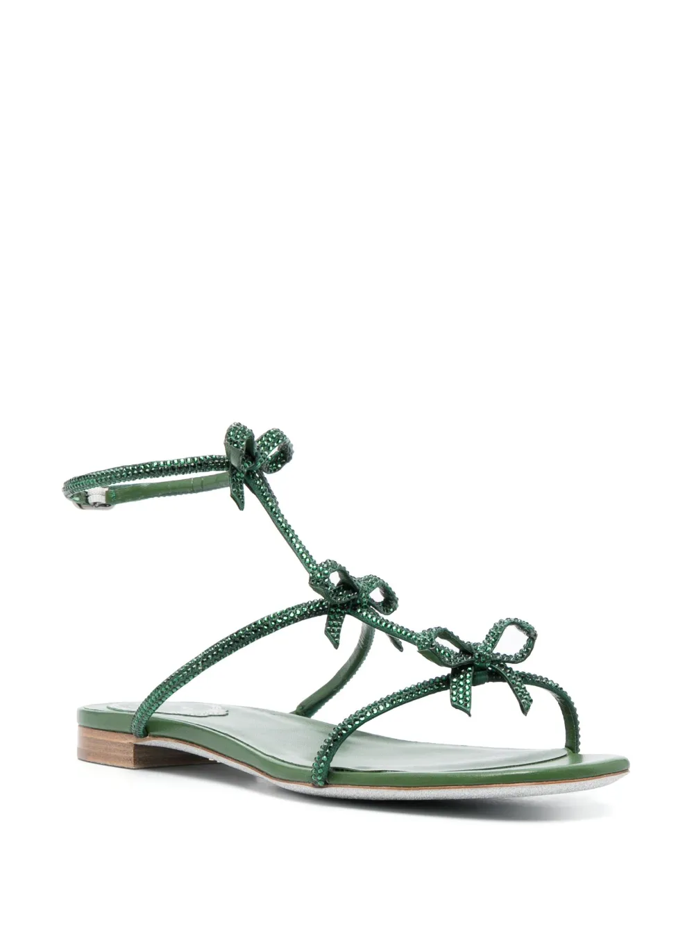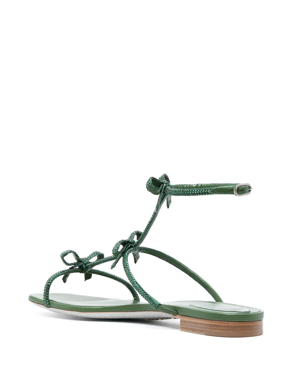 Verde giada, pelle di vitello, decorazione in cristalli, dettaglio fiocco, cinturino a T, punta smussata aperta, chiusura alla caviglia con fibbia, plantare con logo e suola piatta in gomma.
