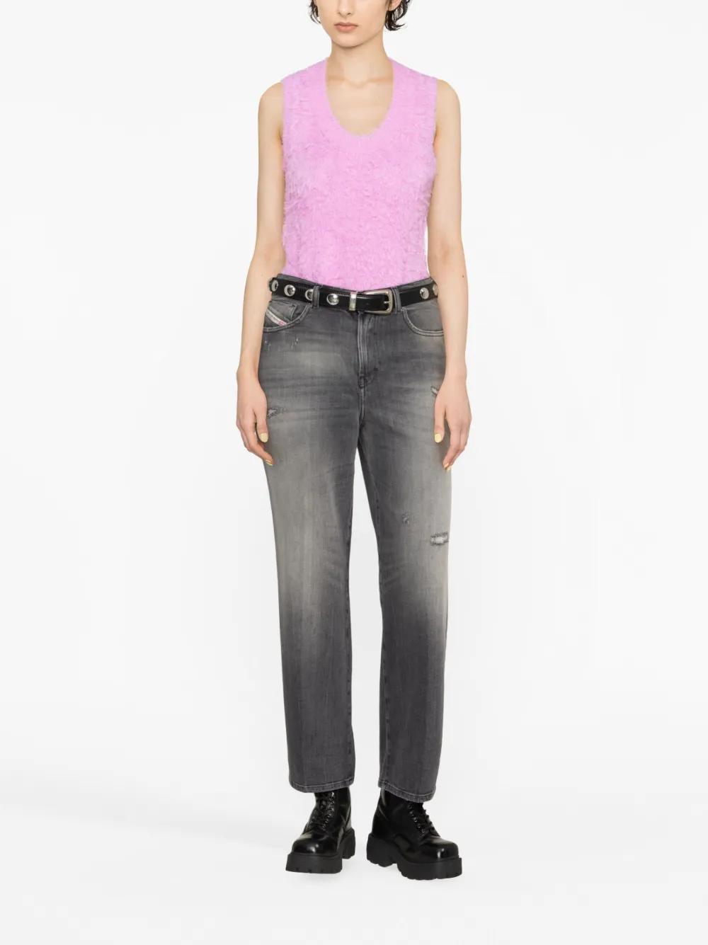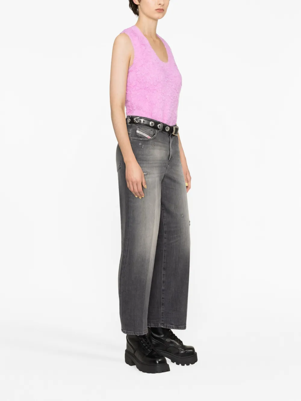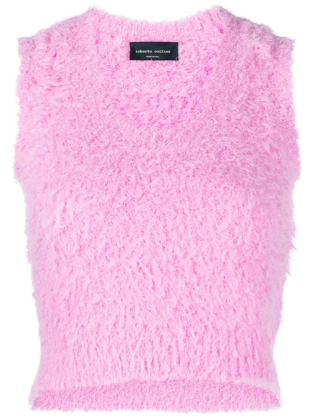 Rosa bubblegum, misto cotone, finitura in rilievo, scollo a U, senza maniche, design crop e orlo dritto.