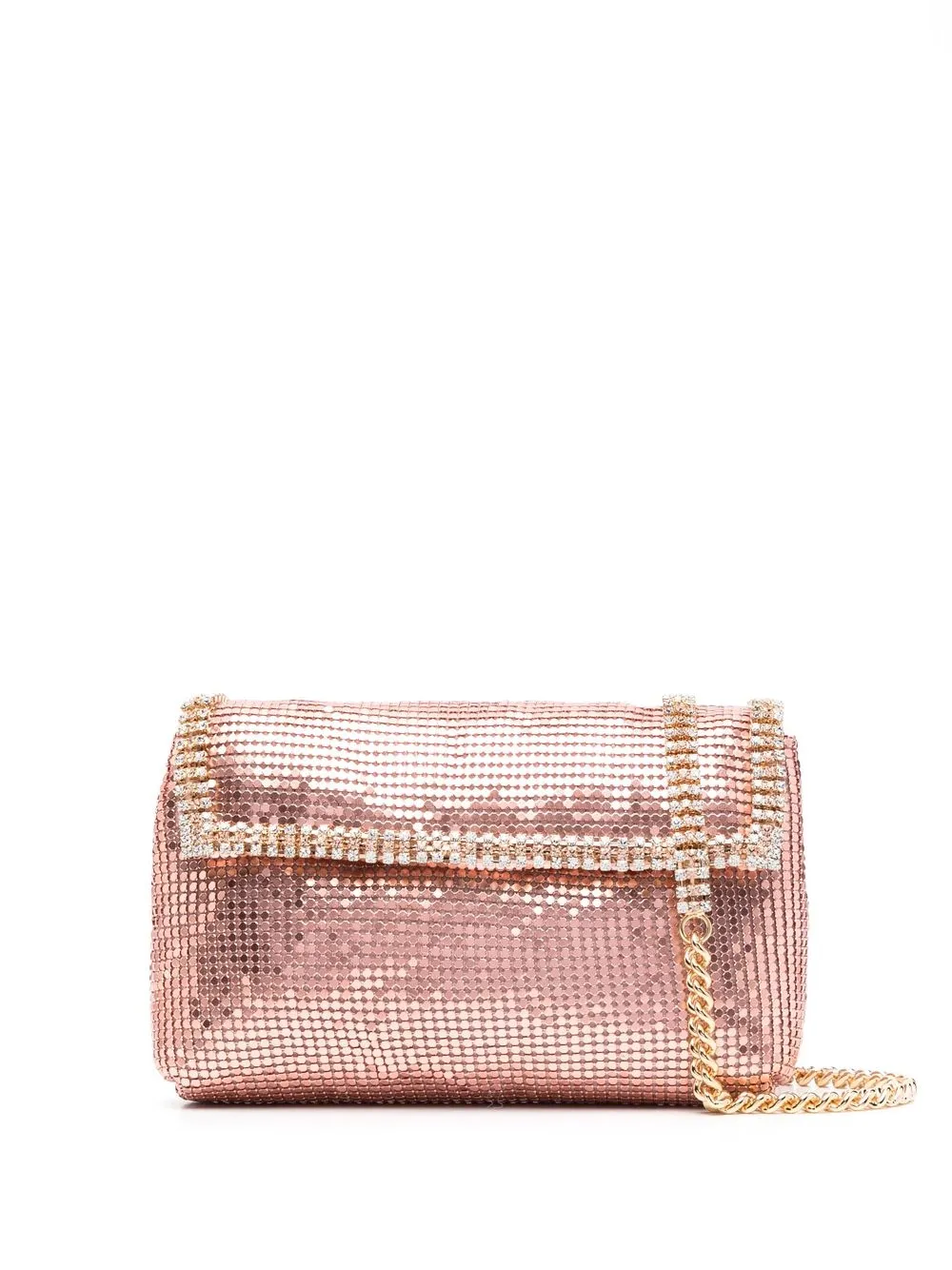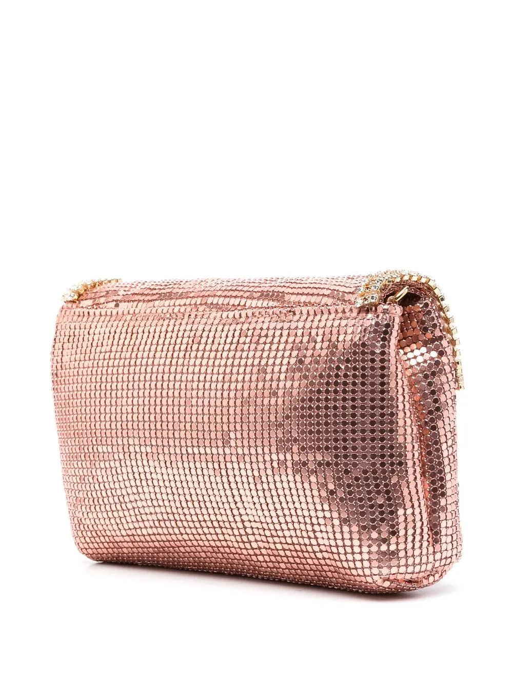 Rosa pesca, dettagli color oro, decorazione con cristalli sintetici, battente nella parte superiore con chiusura magnetica, scomparto unico, tasca interna a soffietto, applicazione interna con logo e tracolla a catena.
