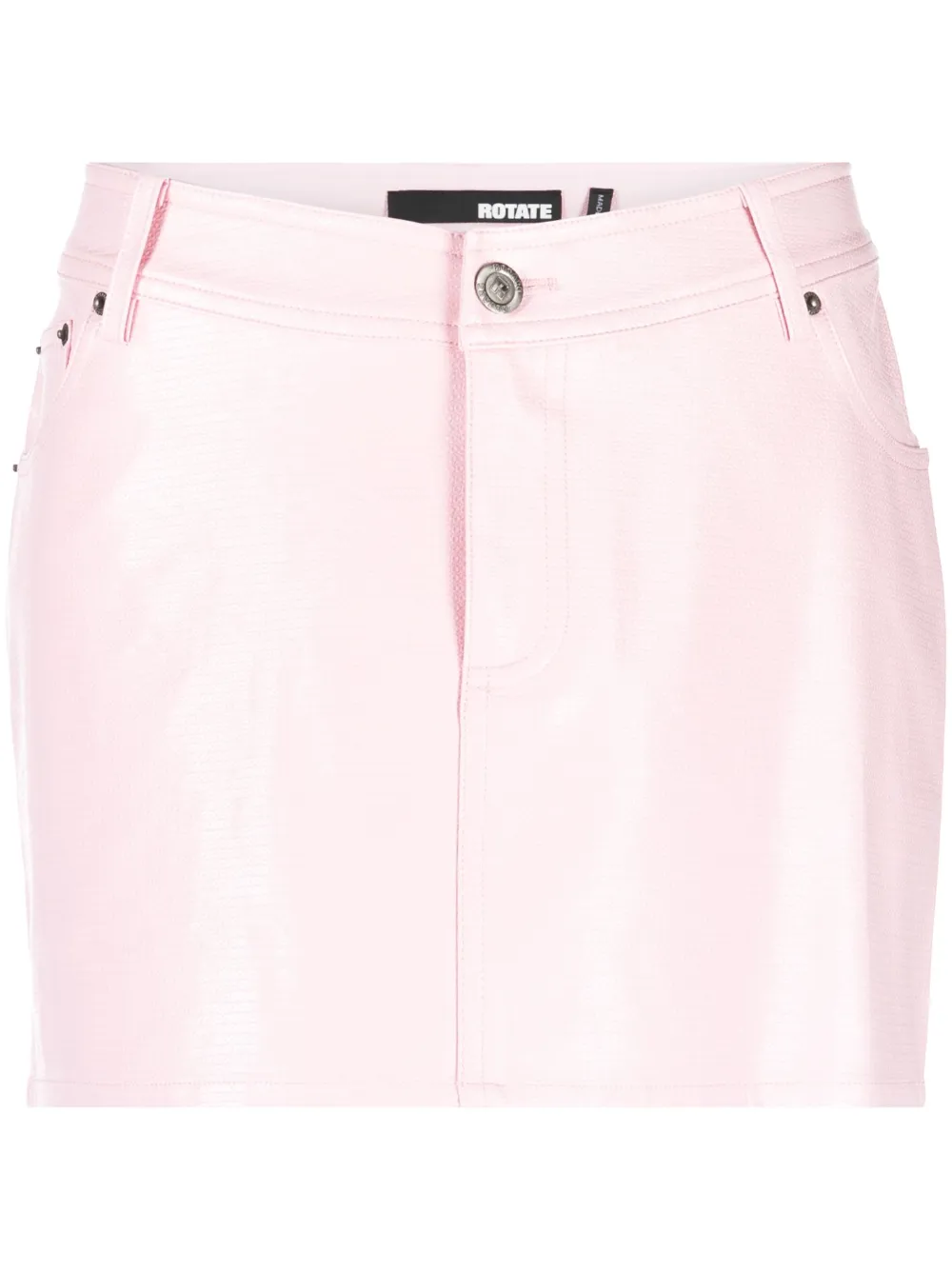 Rosa chiaro, pelle cruelty-free, vita bassa, passanti, chiusura frontale con bottoni e zip, design classico a cinque tasche, orlo dritto e fodera in raso.