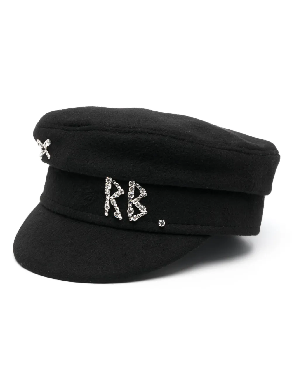 crystal-embellished pull-on beret from RUSLAN BAGINSKIY featuring black, wool, cotton, crystal embellishment, curved peak and pull-on style.