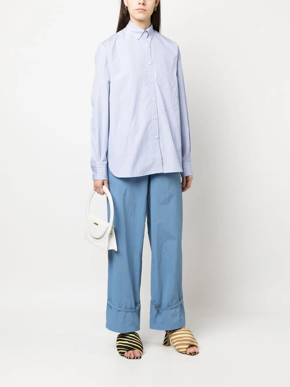 Stampa a righe, design con pieghe a cannone, chiusura frontale con bottoni, colletto classico, maniche lunghe, orli con bottone e orlo curvo.
