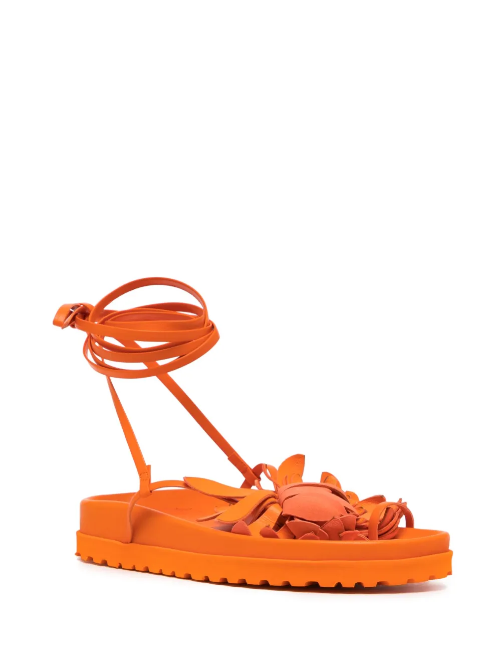 Cuoio, arancione zucca, applicazione a fiori, punta aperta, chiusura con nodo alla caviglia, soletta in pelle con logo e suola in gomma antiscivolo.