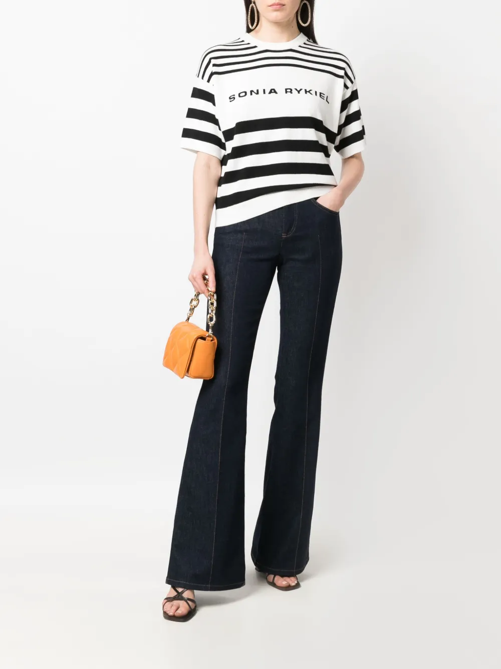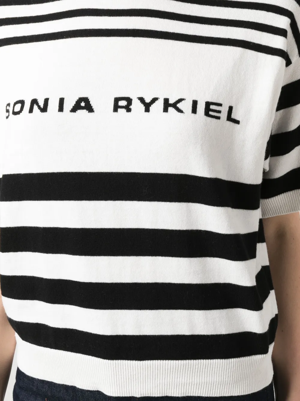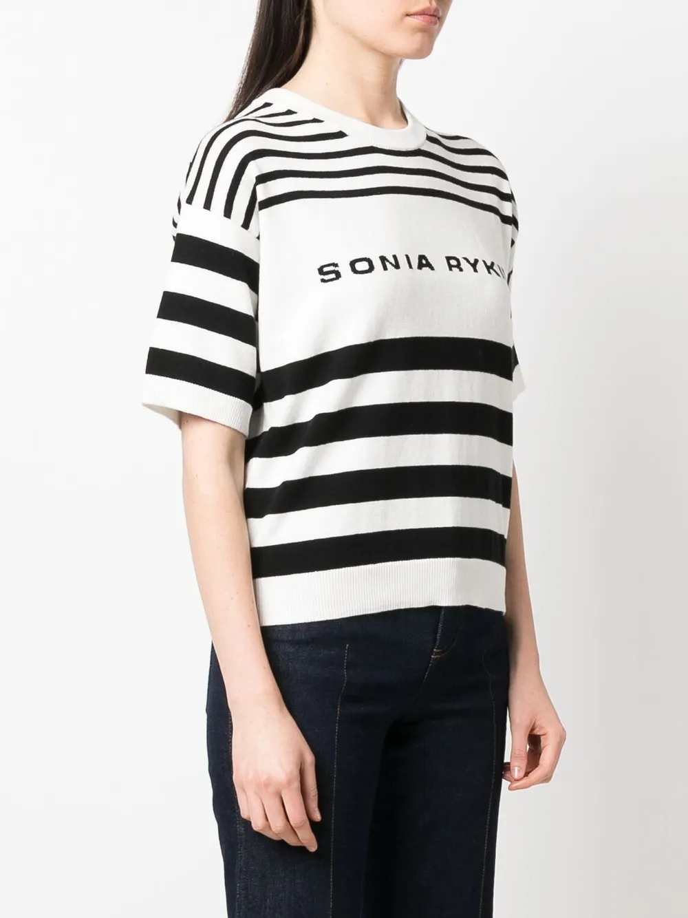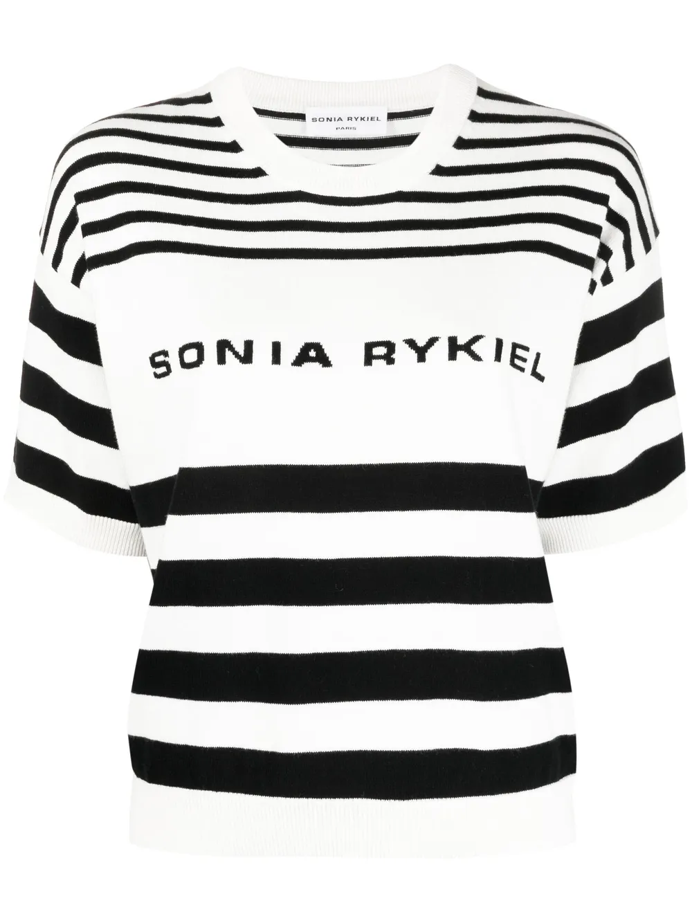 Design lavorato a maglia, motivo a righe orizzontali, logo intarsiato, maniche corte, girocollo, orlo a coste e polsini a coste.