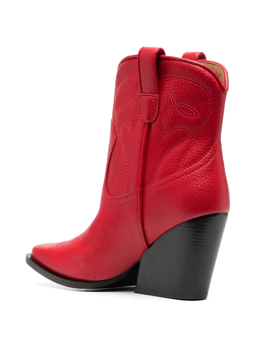 Rosso brillante, pelle di vitello, punta quadrata, fodera integrale, design pull on e tacco cubano.