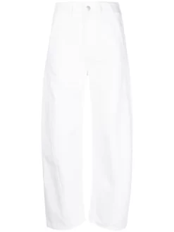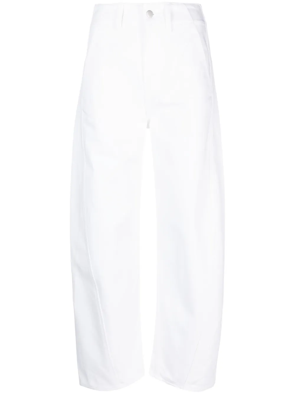 Bianco ottico, misto cotone, passanti, chiusura frontale con bottoni e zip, due tasche laterali a filetto, due tasche posteriori nascoste e taglio straight.