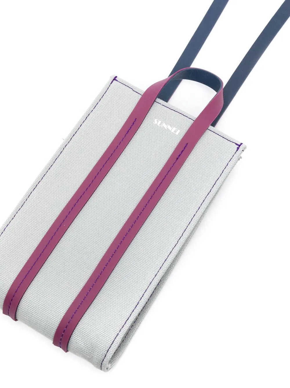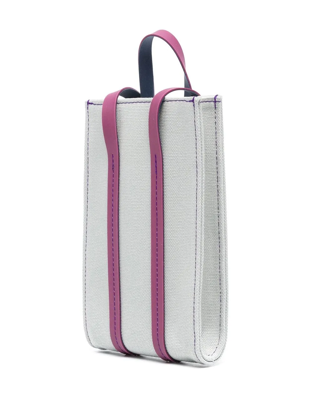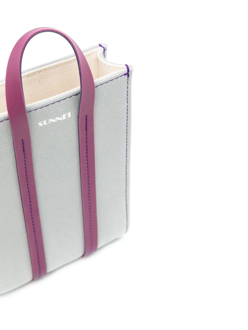 Grigio chiaro, magenta, blu navy, tela, bordo a contrasto, cuciture a contrasto, stampa con logo sul davanti, manico piatto, design con fascia singola, parte superiore aperta e scomparto unico.