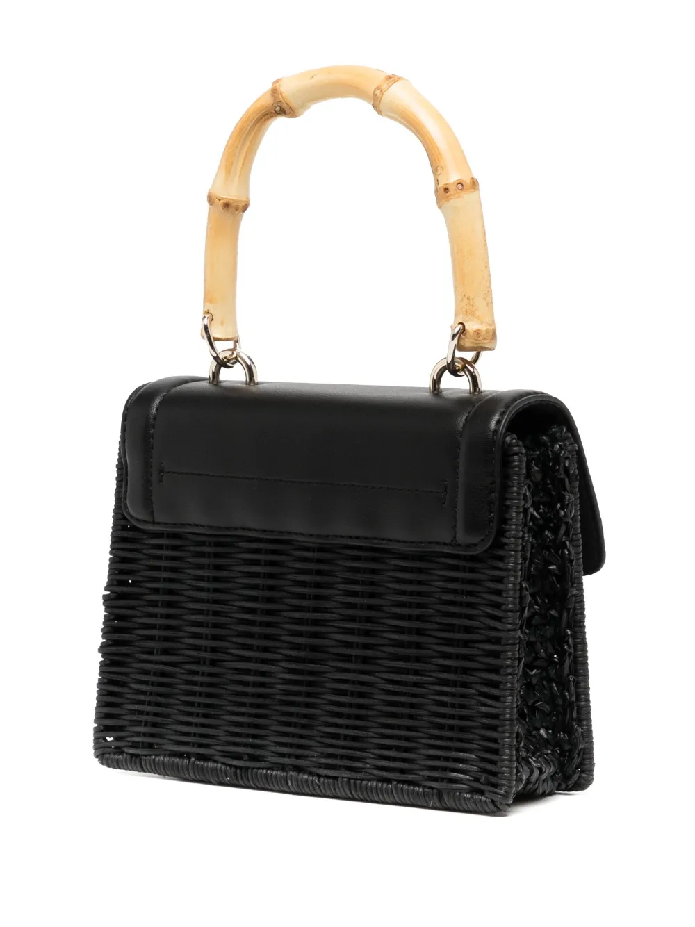 Nero, cotone/pelle, design intrecciato, logo inciso, pattina superiore con bottone a pressione, tasca interna con zip, manico in legno, tracolla a catena e scomparto unico.