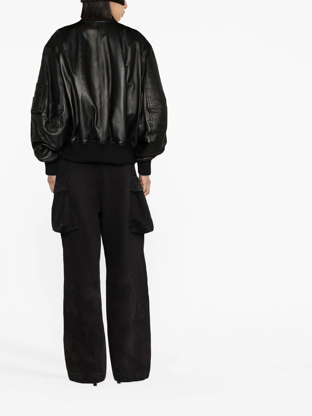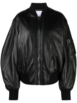 Nero, pelle di agnello, colletto a coste, chiusura frontale con zip, due tasche frontali a filetto, maniche lunghe, tasca con zip nella manica e rifinitura a coste.