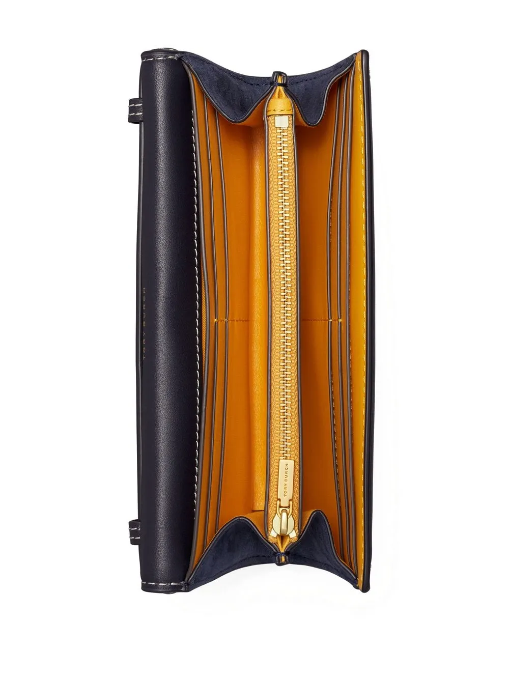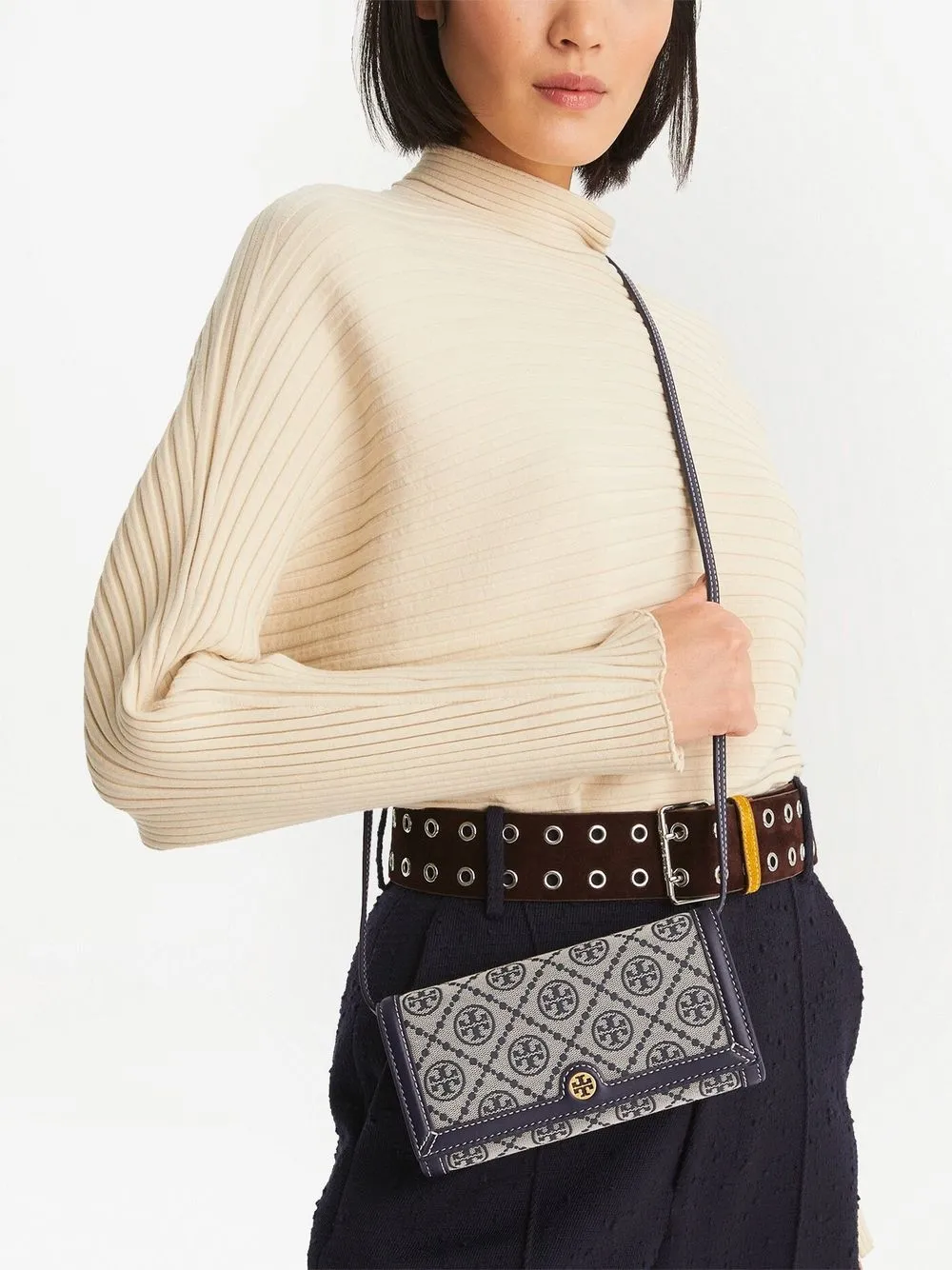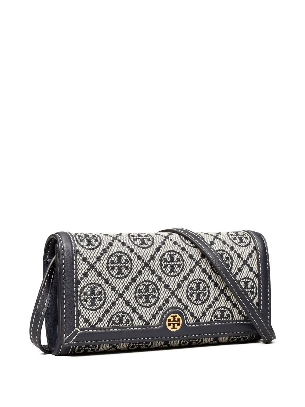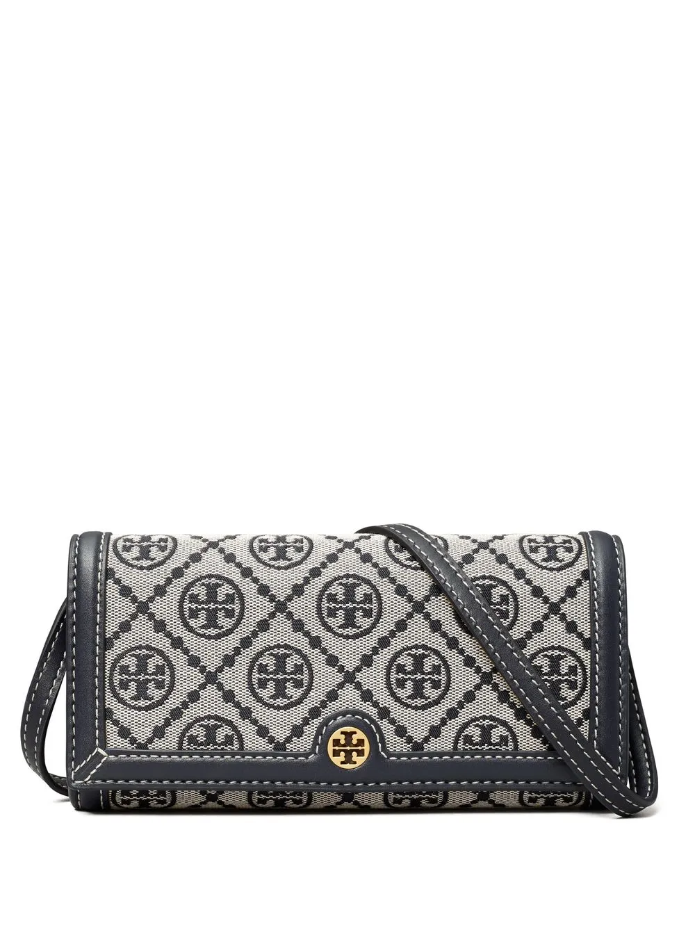 Blu navy, pelle, jacquard con monogramma, placca con logo color oro, tracolla regolabile e pattina nella parte superiore.