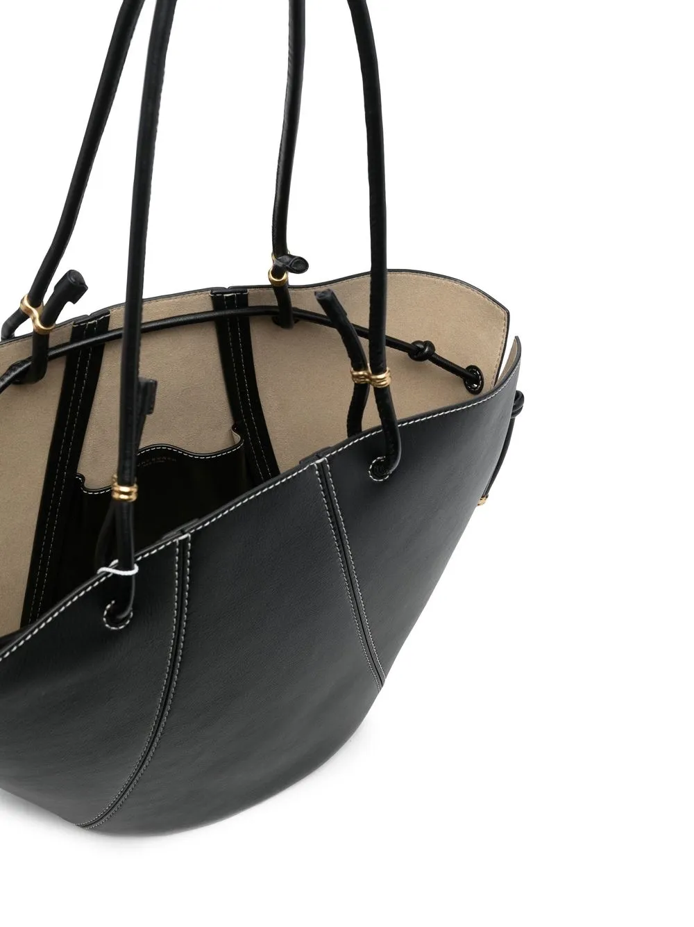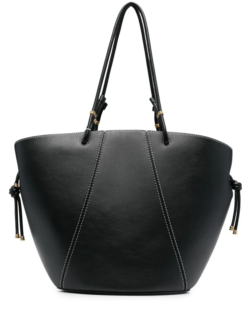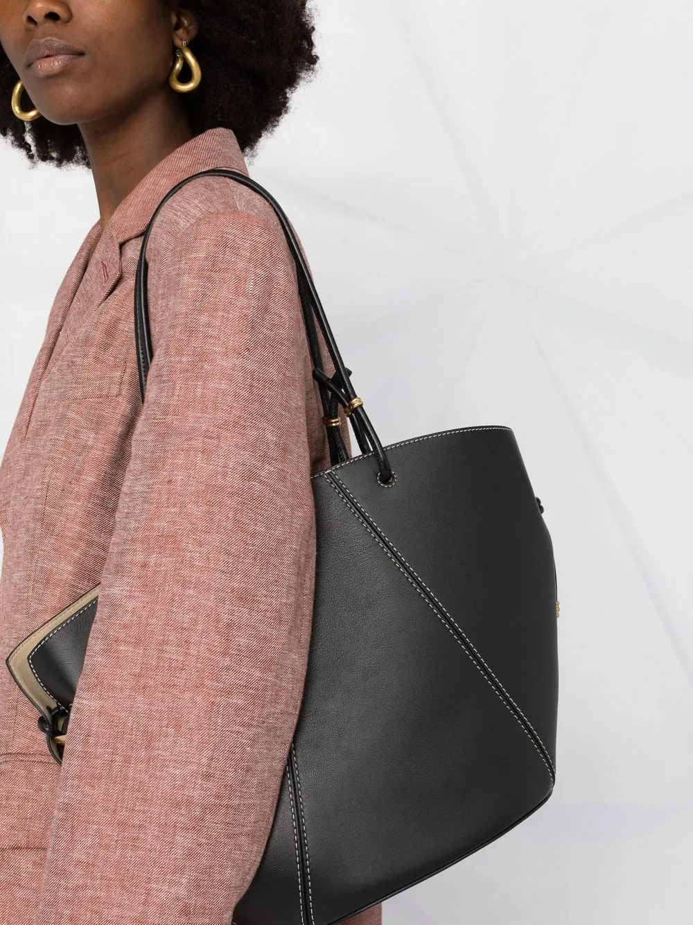 Nero, pelle di vitello, design a inserti, cuciture a contrasto, dettagli color oro, due manici lunghi e scomparto unico.