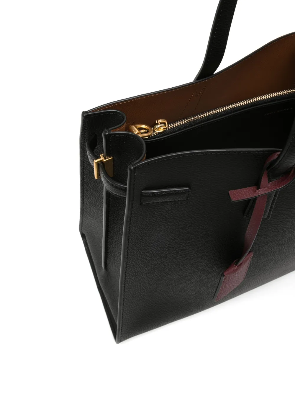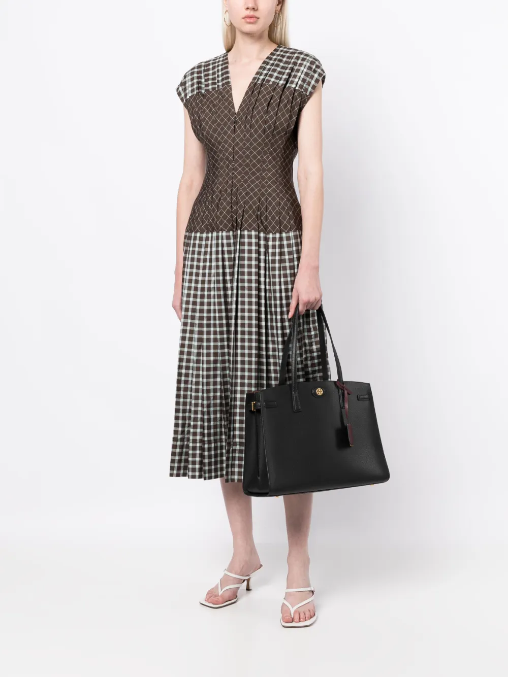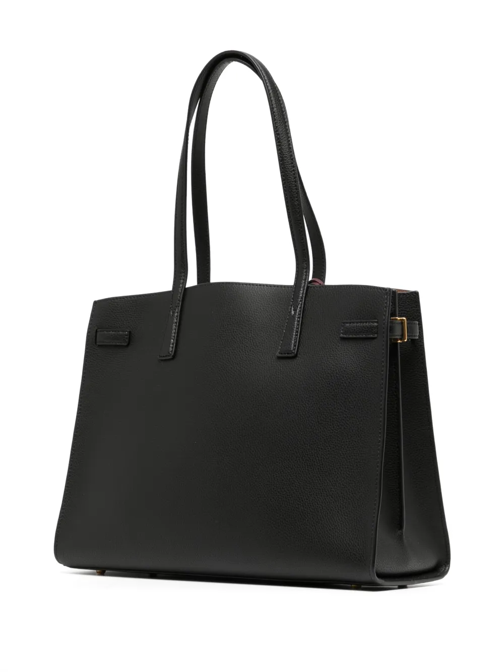large Robinson tote bag from TORY BURCH featuring gold-tone logo plaque, logo tag, two flat top handles, top zip fastening, adjustable detachable shoulder strap, black, dark brown and calf leather.