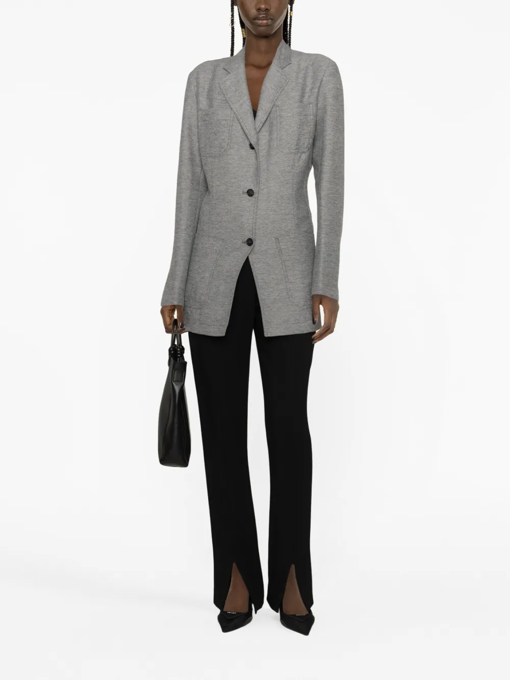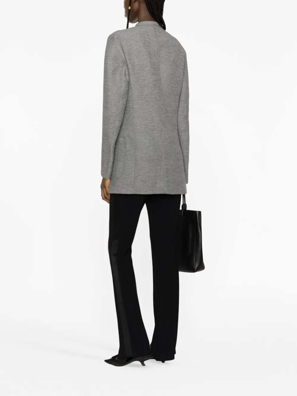 Grigio, effetto mélange, revers classici, chiusura frontale con bottoni, vita aderente, maniche lunghe, quattro tasche frontali applicate e design senza fodera.