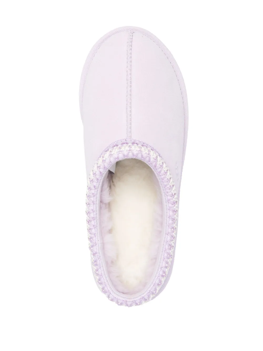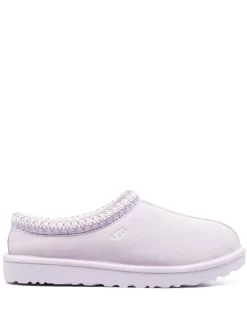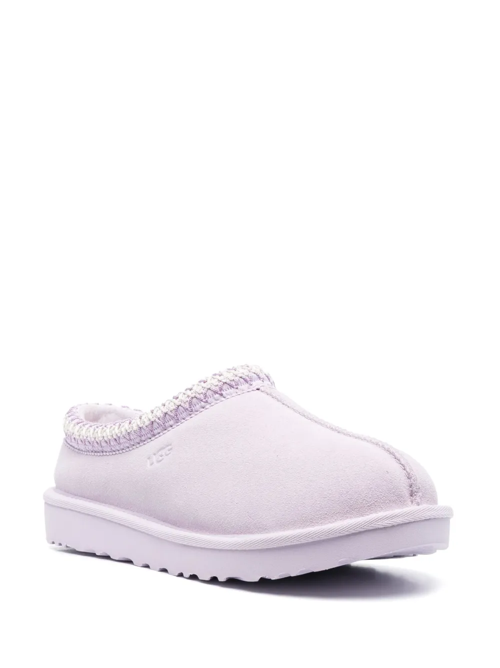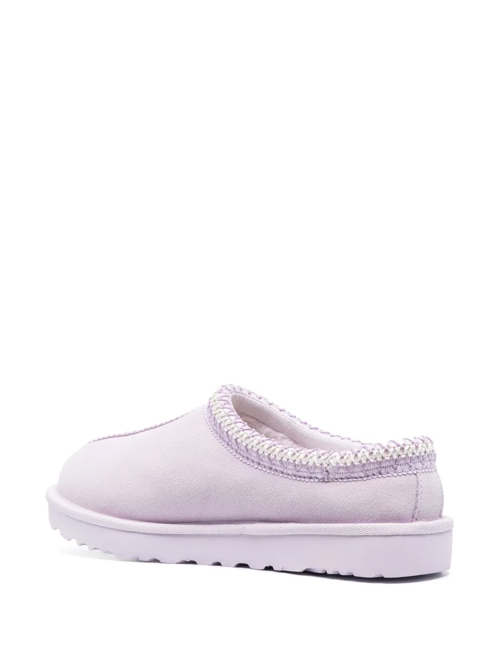 Lavanda, pelle scamosciata di vitello, logo laterale goffrato, cuciture a contrasto, punta tonda, design slip-on e suola piatta in gomma.