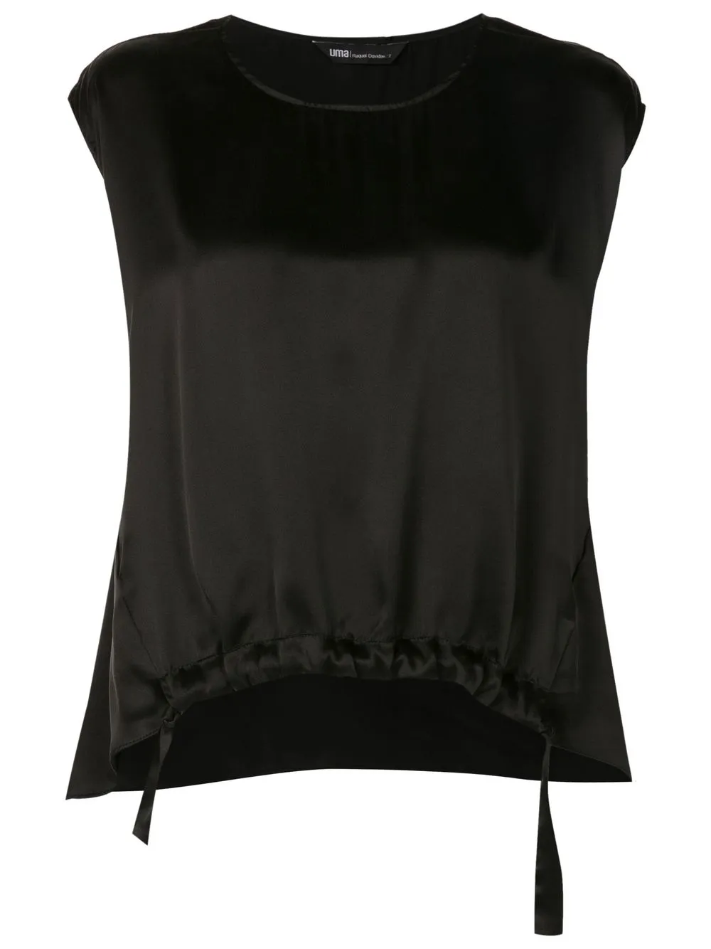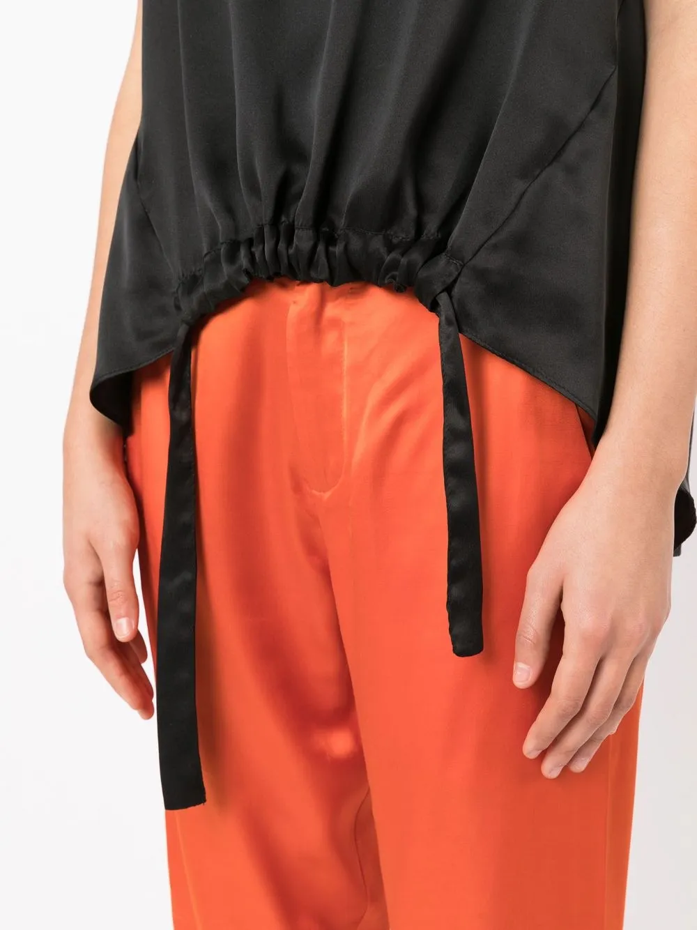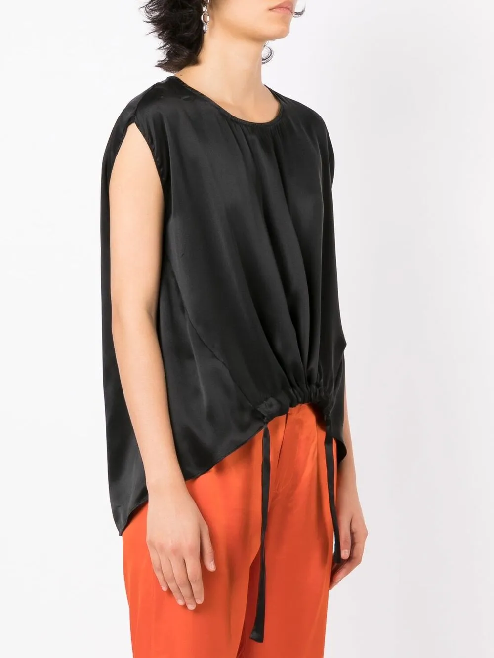 Nero, seta, finitura satinata, senza maniche, scollo rotondo, orlo con coulisse e orlo asimmetrico.