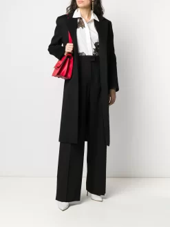 Nero, pelle di vitello, grana liscia, dettagli color oro, stampa con logo sul davanti, chiusura frontale con zip, scomparto unico, applicazione interna con logo e tracolla in pelle con catena.