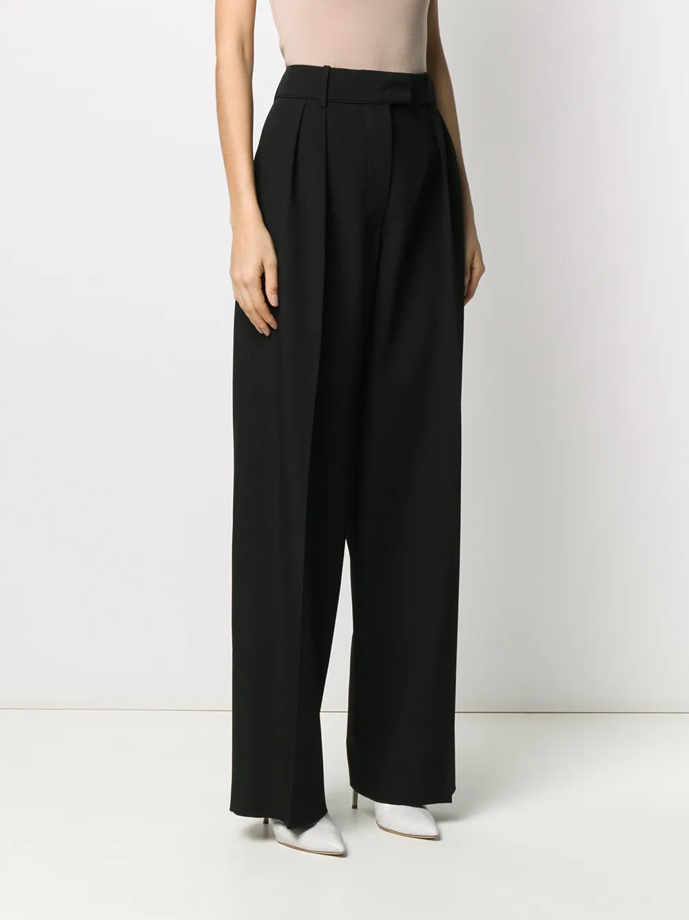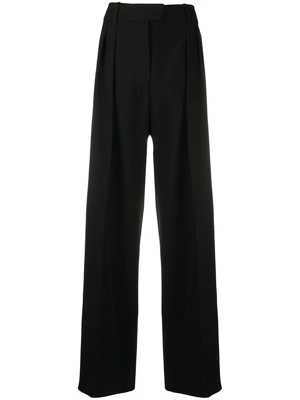 Vita alta, chiusura frontale nascosta, passanti, due tasche con inserti e tasca posteriore con patta. Materiale: lana vergine. Colore: nero.