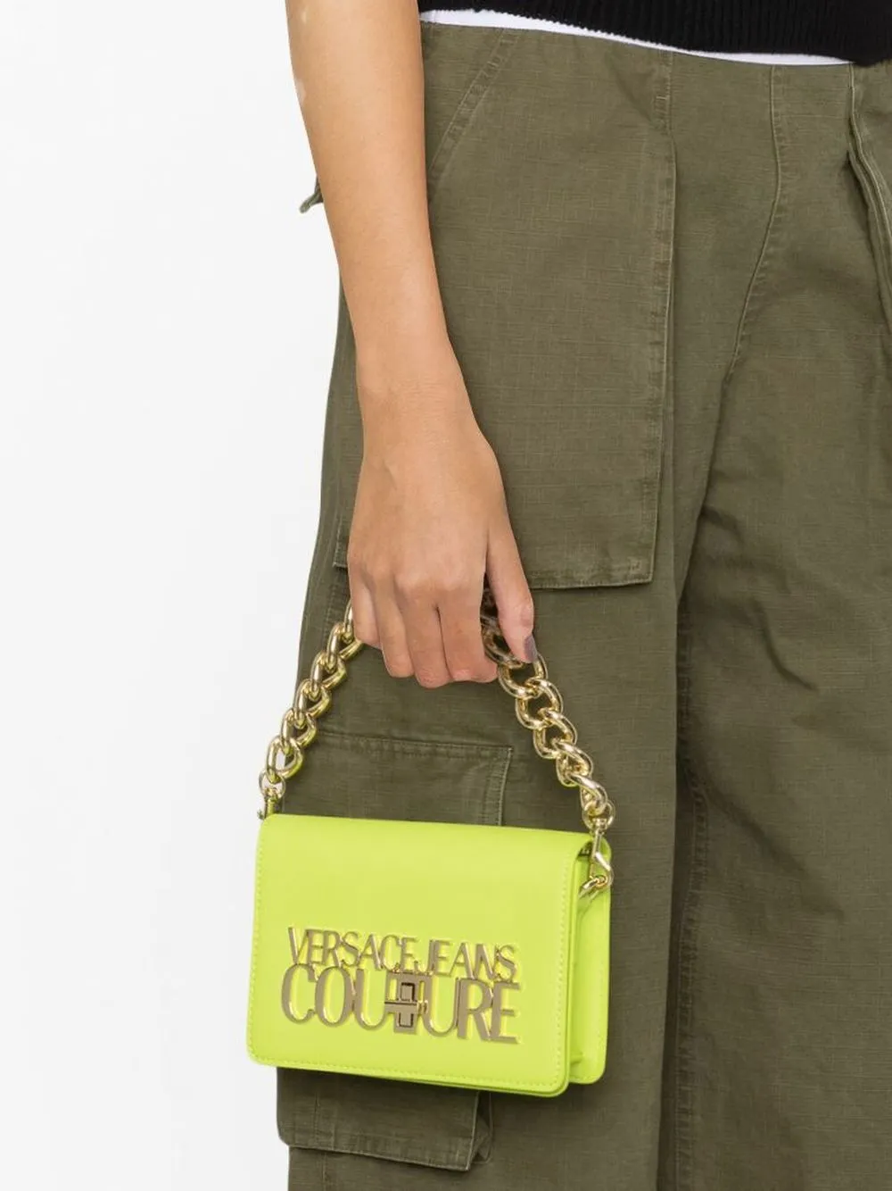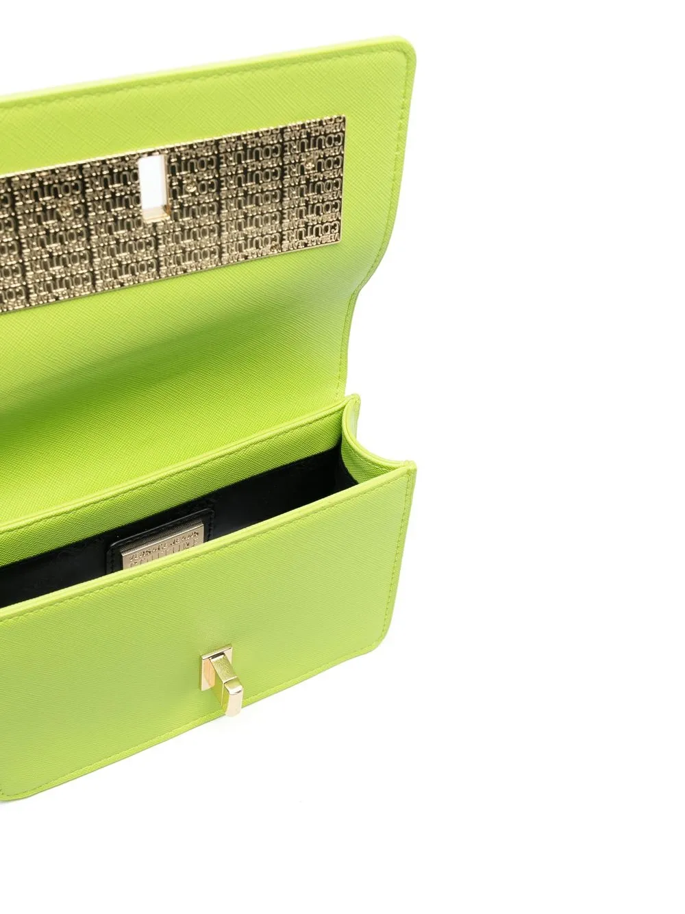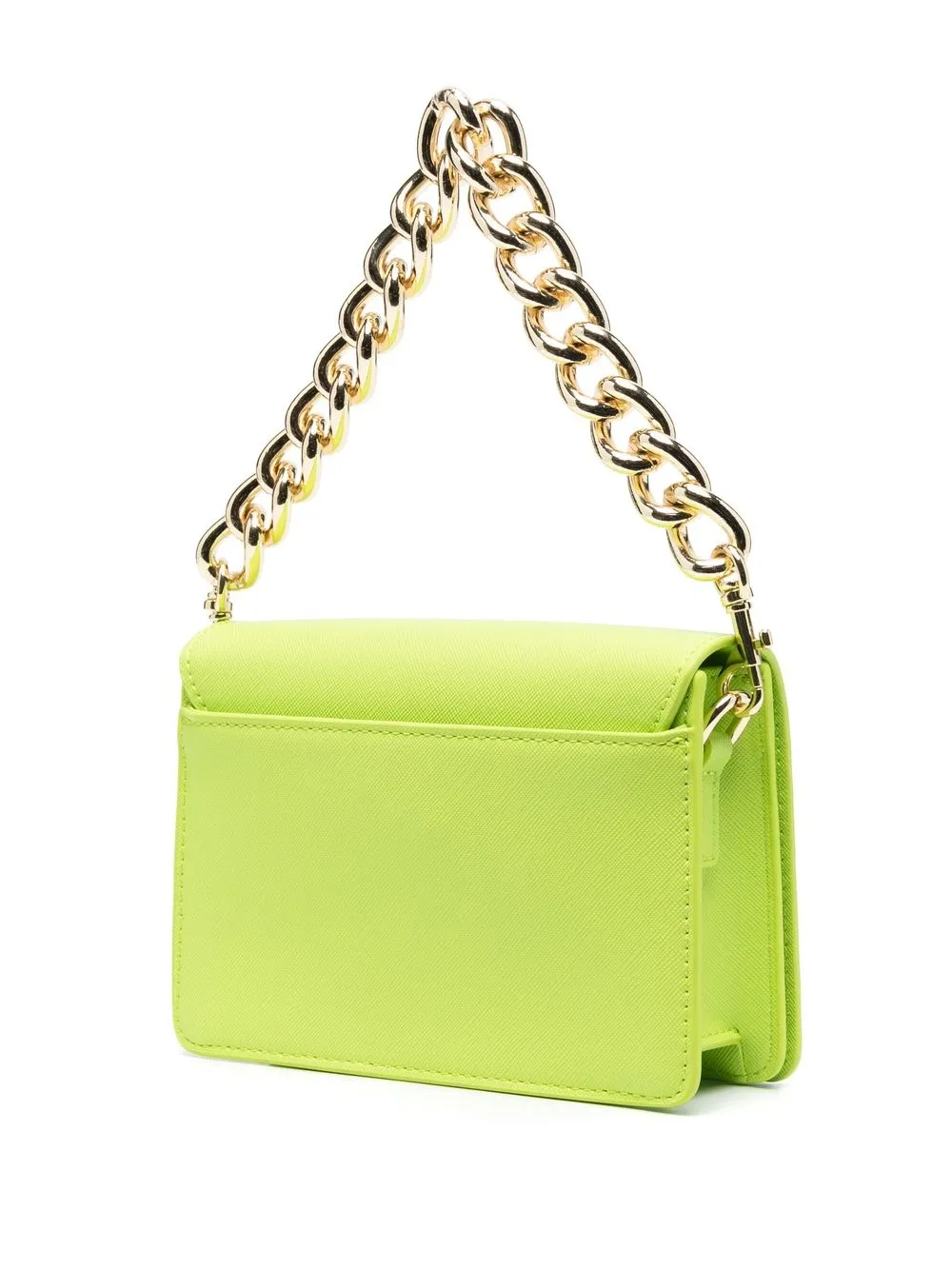 Lime, logo in lettere color oro, pattina nella parte superiore, chiusura a girello, manico superiore rimovibile con catena, tracolla rimovibile con catena, scomparto unico e fessura portacarta interna.
