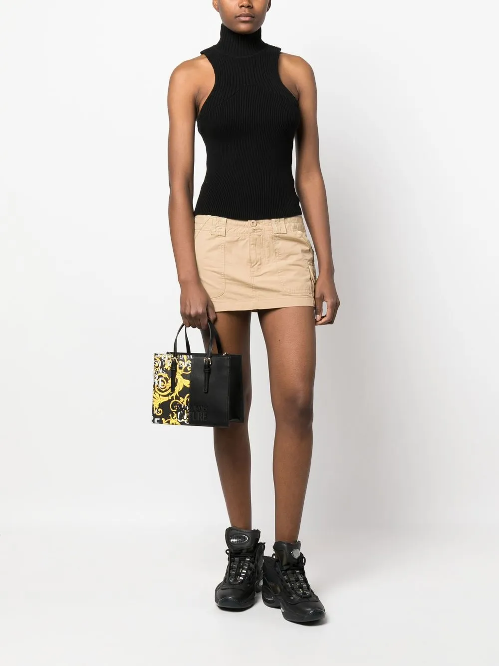 Nero, caratteristica stampa Barocco, manici rotondi, dettagli color oro e placca con logo.