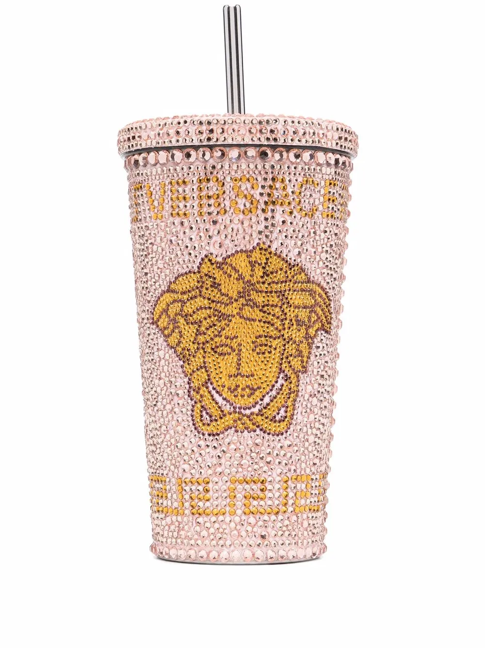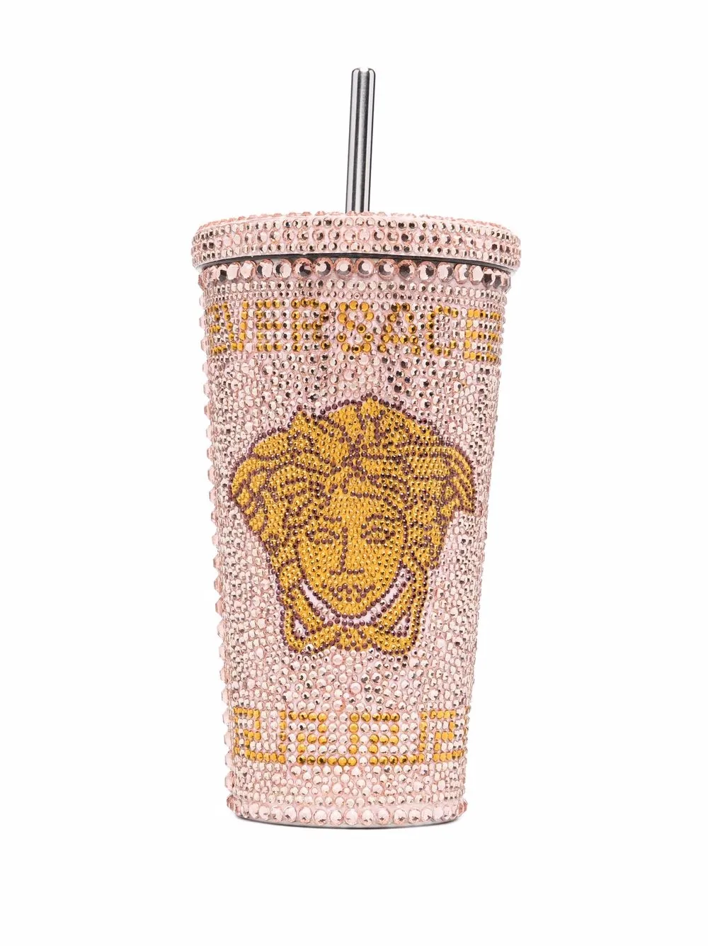 Tazza da viaggio Medusa con decorazione Versace. Modello con decorazione in cristalli, motivo a testa di Medusa, chiusura superiore a girello e dettaglio caratteristico con motivo a Greca.