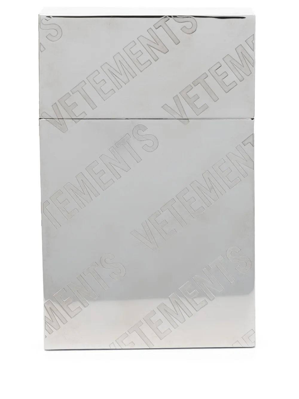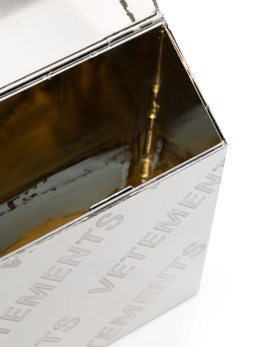 Color argento, stampa con monogramma, effetto metallico, dettagli color argento, pattina nella parte superiore, chiusura con fermaglio, scomparto unico e design rettangolare.