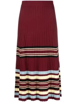 Wander pleated knitted midi skirt from Wales Bonner featuring bordeaux red, multicolour, knitted construction, horizontal stripe pattern, fully pleated, elasticated waistband, flared hem and below-knee length.