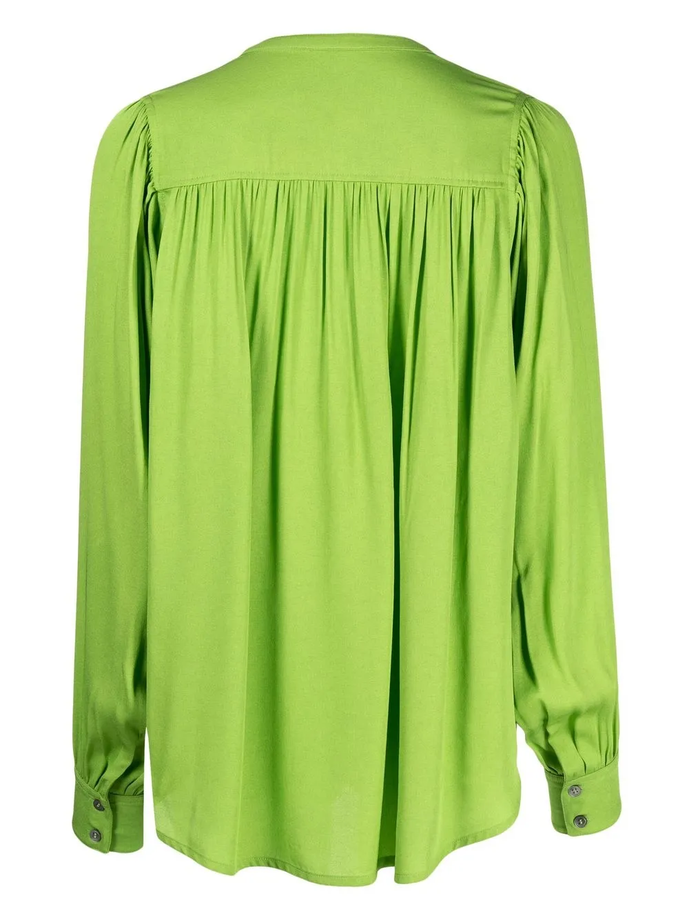 Verde mela, dettaglio con arricciature, orlo curvo, chiusura decentrata frontale con bottoni, polsini con bottoni e maniche lunghe.